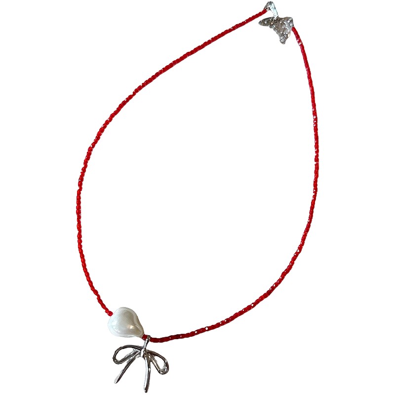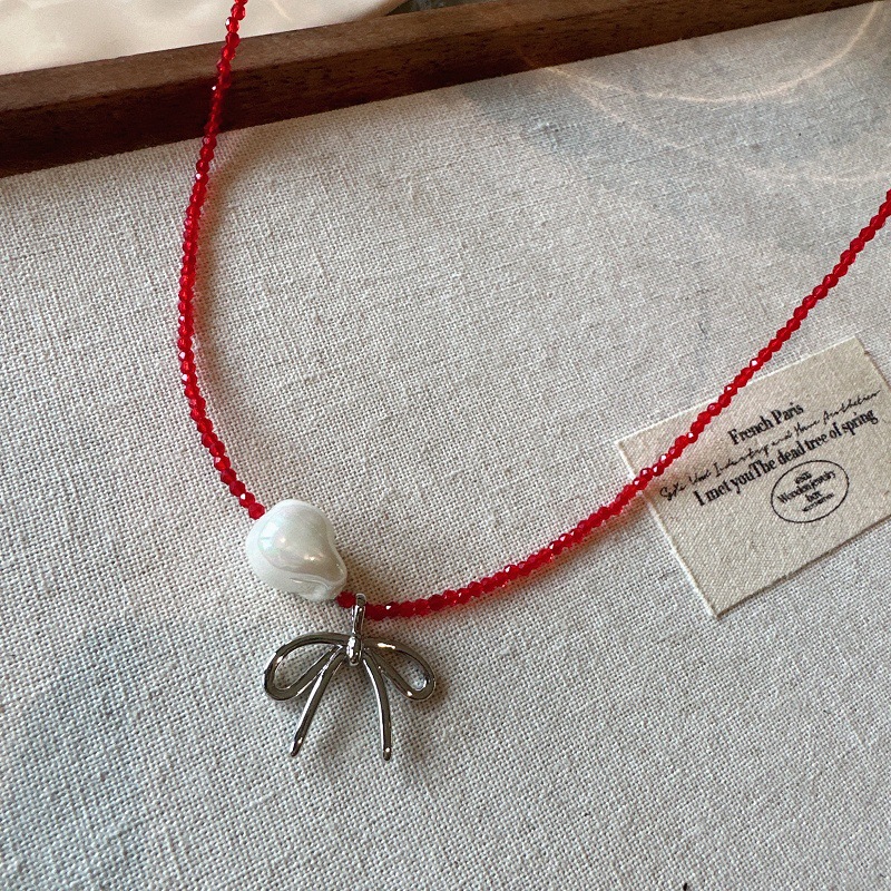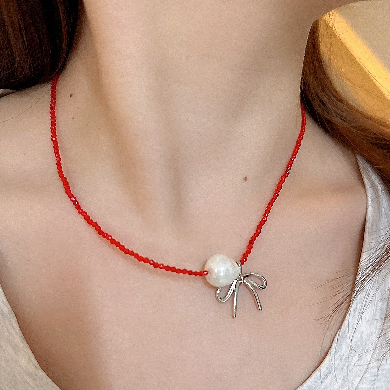 小众设计巴洛克贝珠锁骨链红色水晶吊坠蝴蝶结项链可调节颈链饰品
