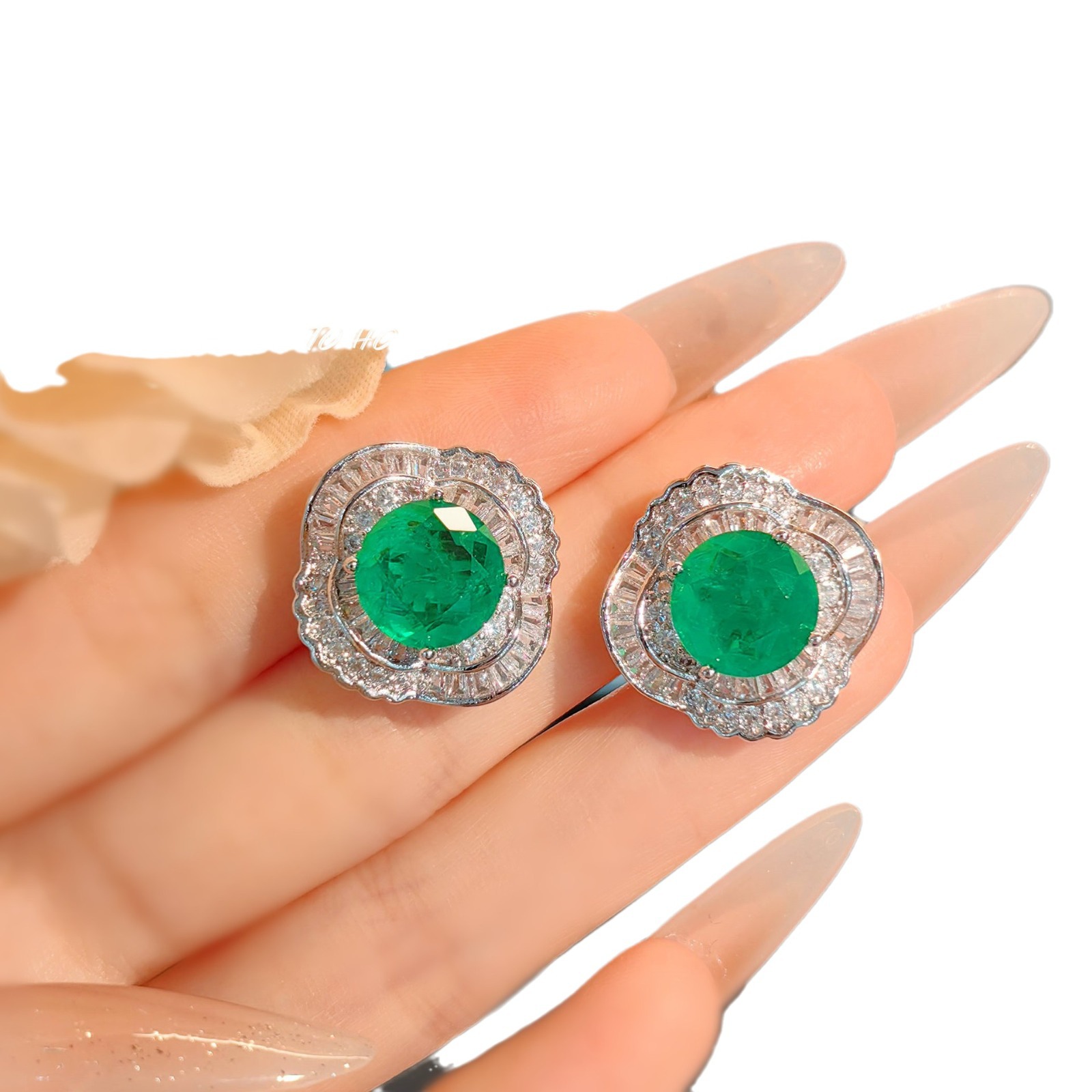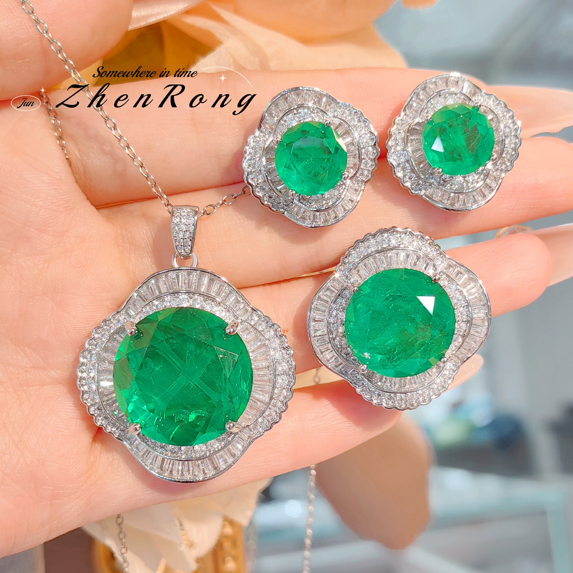 Young新款仿真带棉祖母绿项链彩宝套装吊坠高级戒指高碳钻耳钉女
