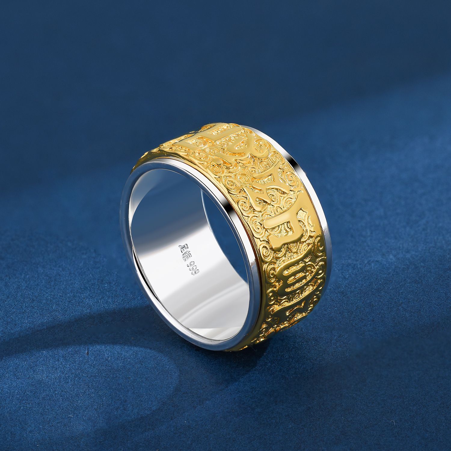 宽版霸气999纯银六字真言可转动戒指男款个性指环单身食指环礼物
