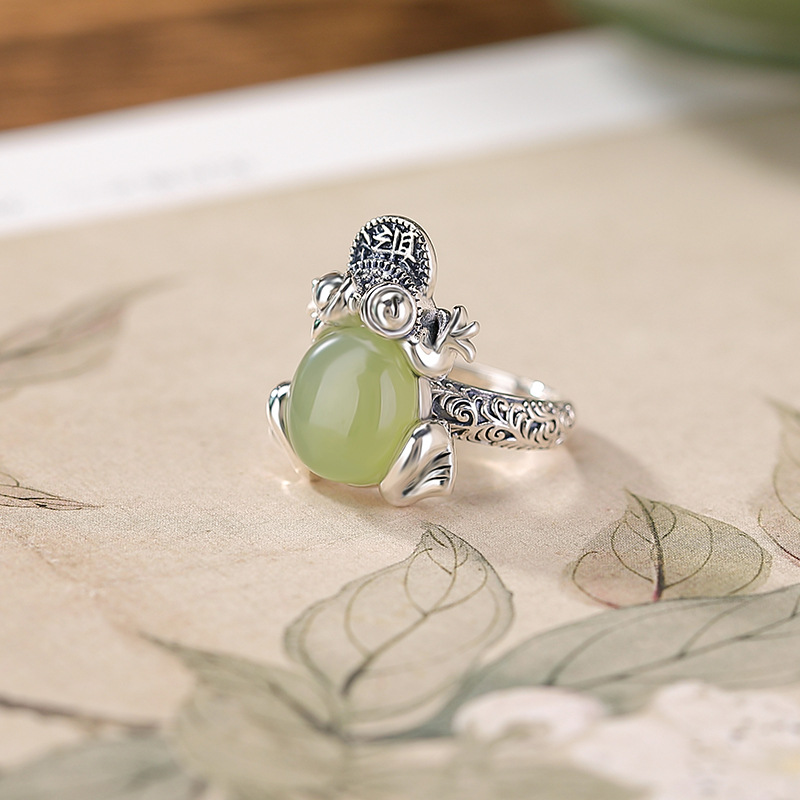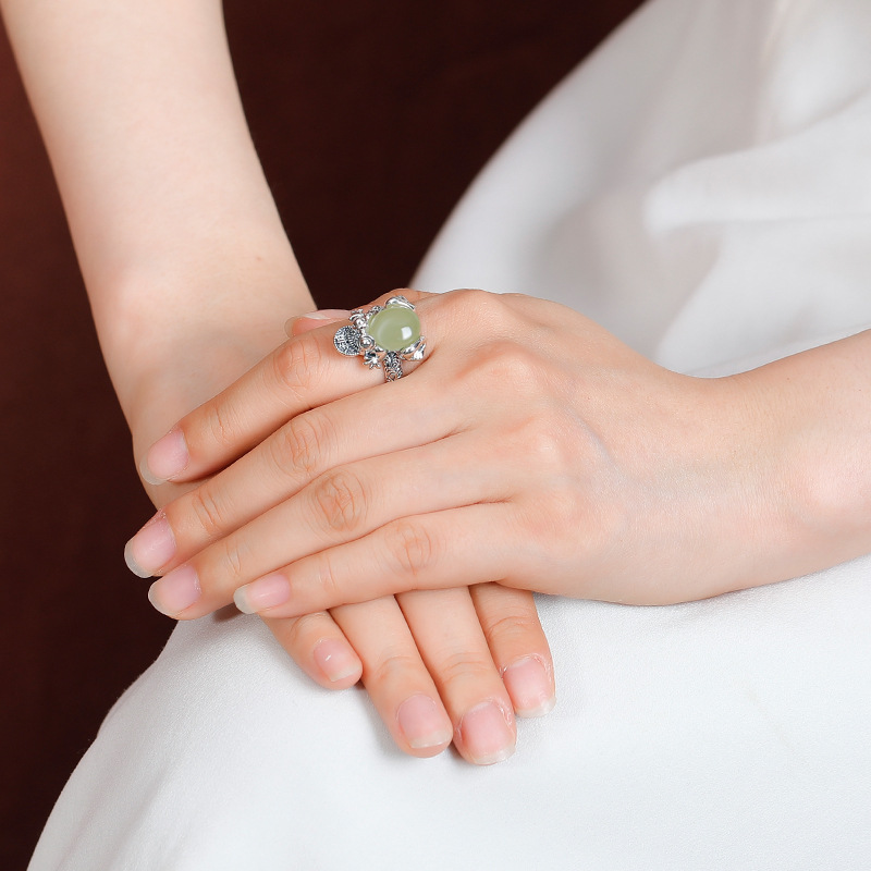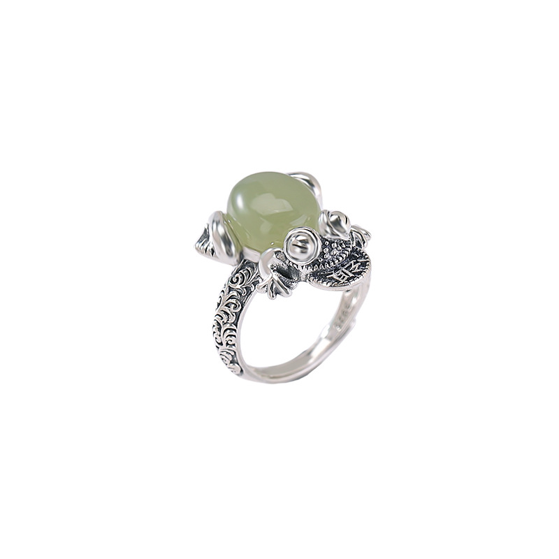 通体S925纯银天然和田玉晴水玉戒指复古做旧金蝉唐草纹开口指环