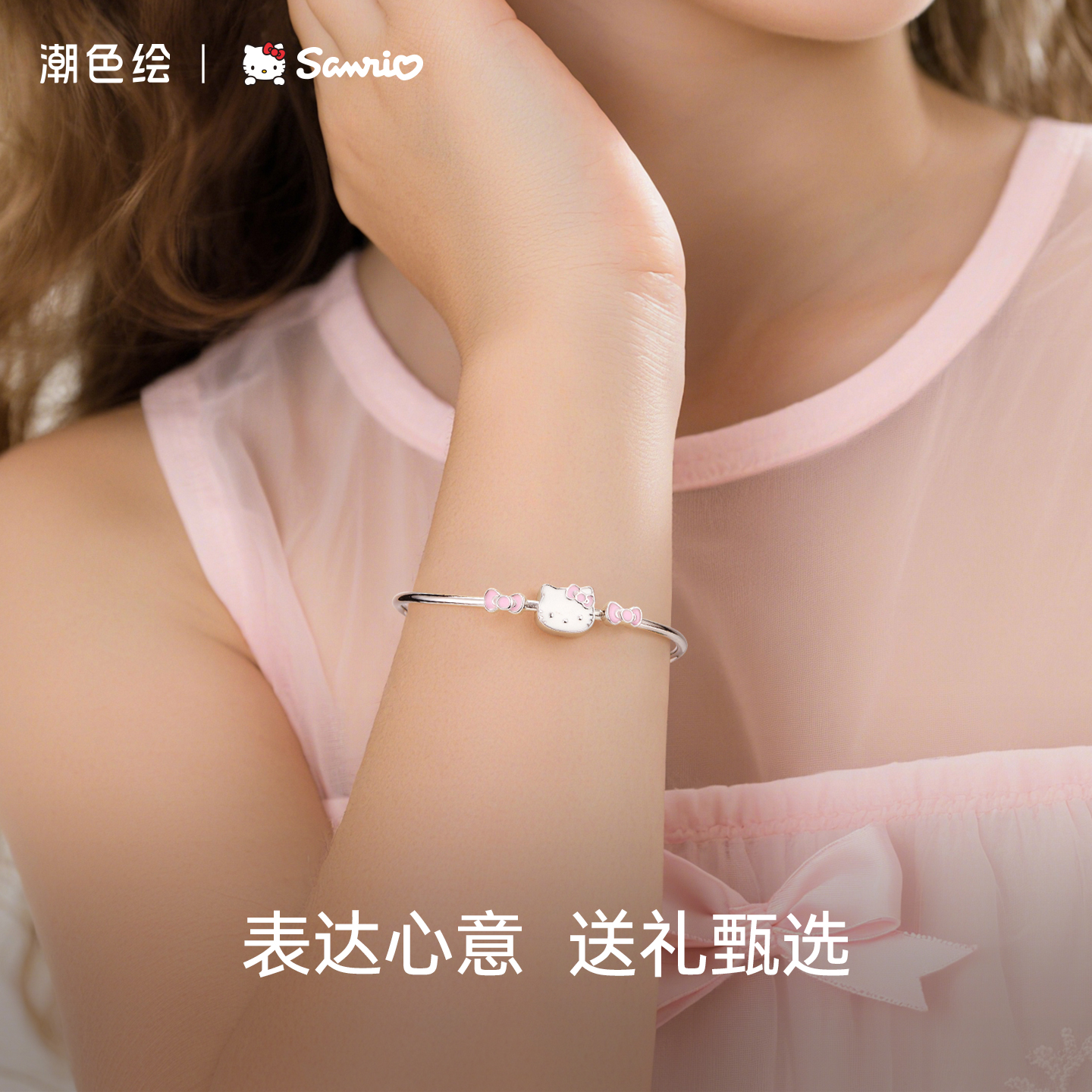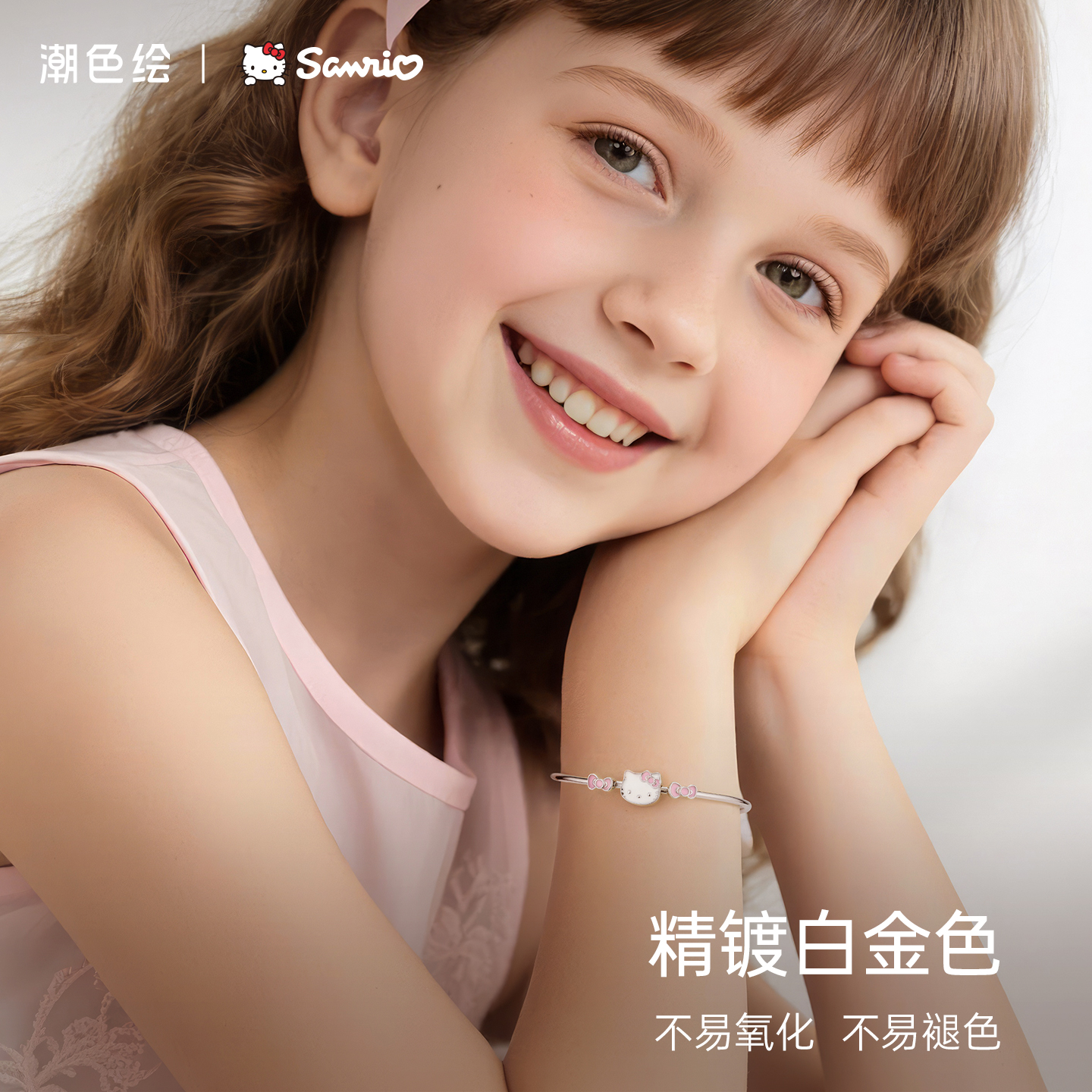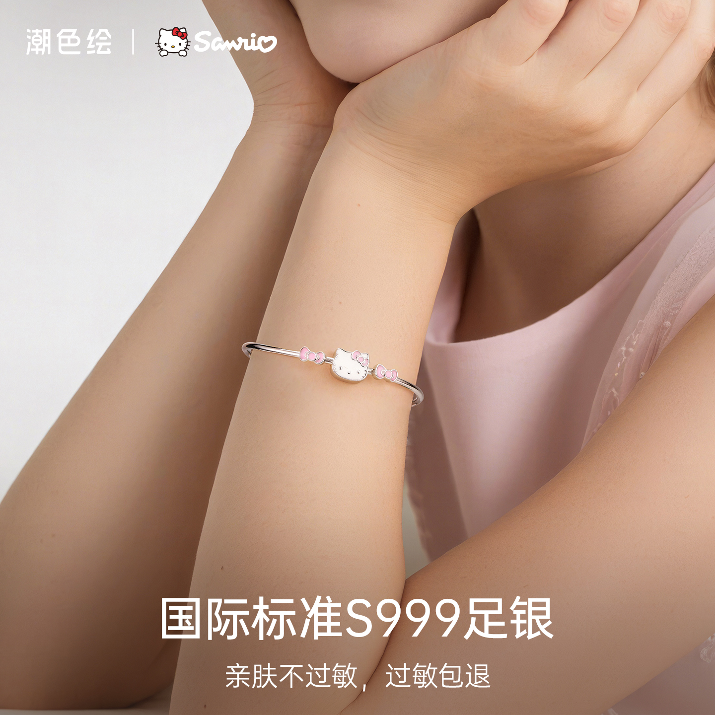 潮色绘凯蒂猫蝴蝶结儿童手镯S999银女款手饰小众轻奢精致生日礼物