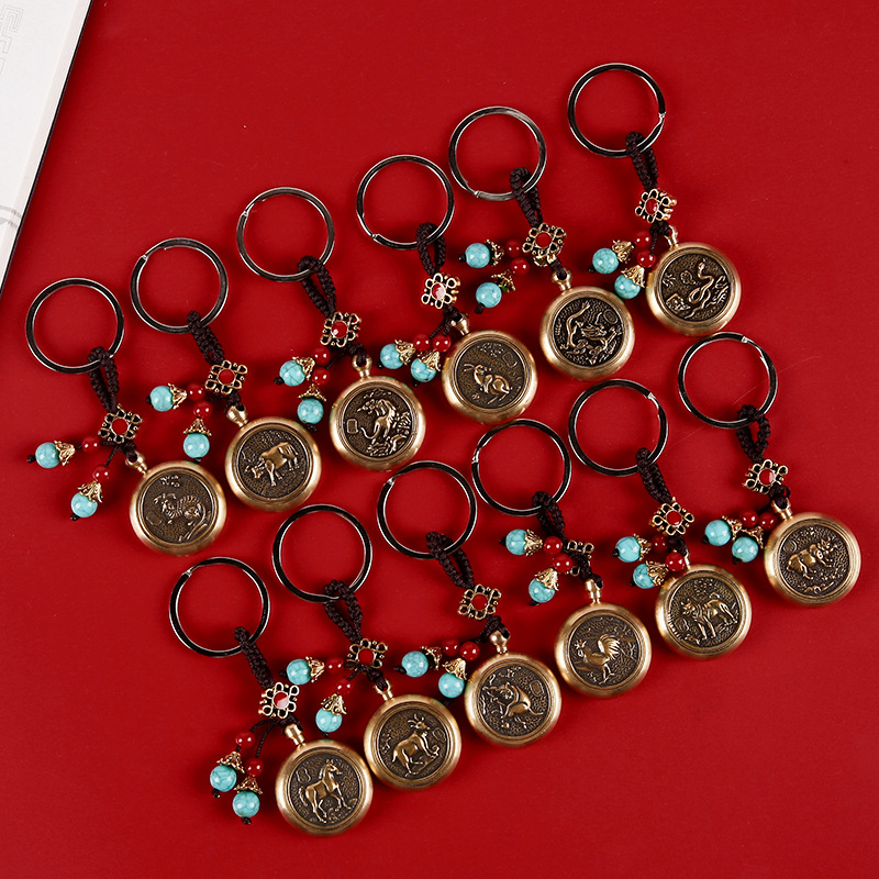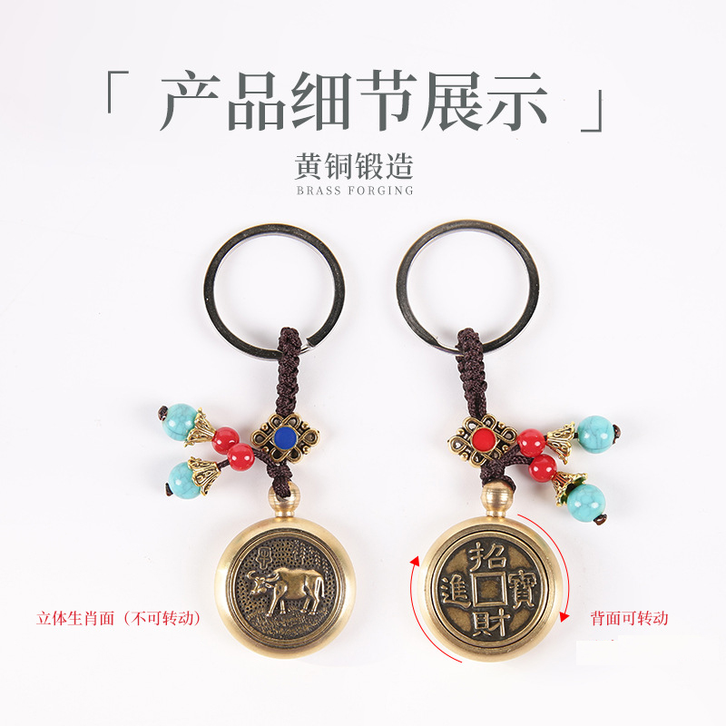 黄铜十二生肖钥匙挂件可旋转解压转运汽车钥匙扣挂饰环圈