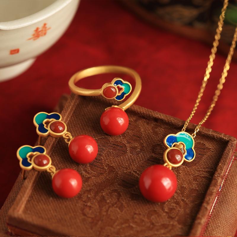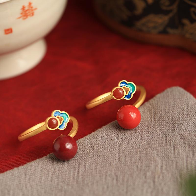 天然朱砂如意纯银戒指女珐琅彩新中式国风红色复古轻奢本命年食指