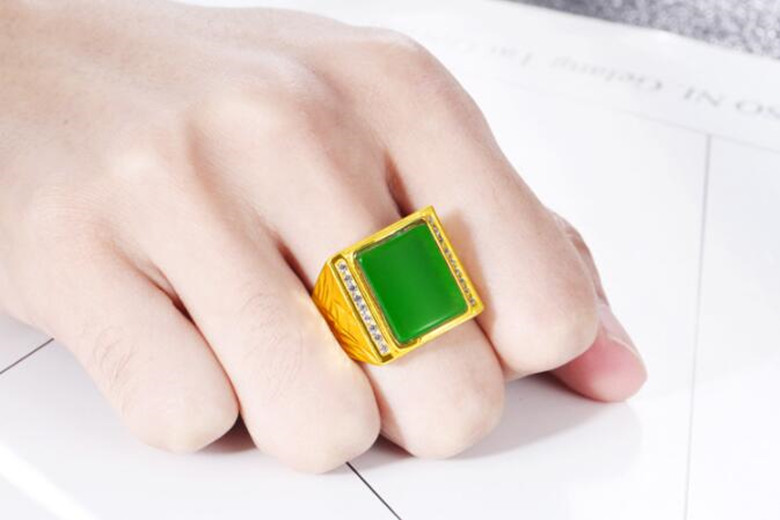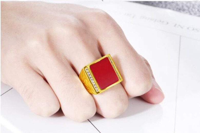 越南沙金戒指 镀24K黄金爆款男士镶钻宝石仿真金开口老板四方戒指
