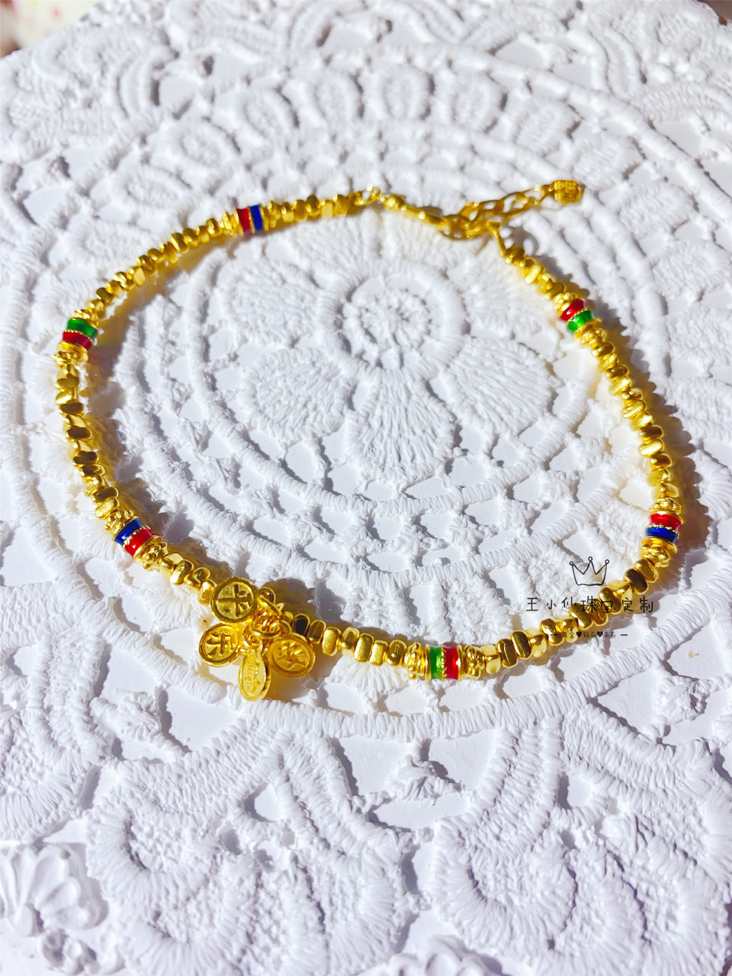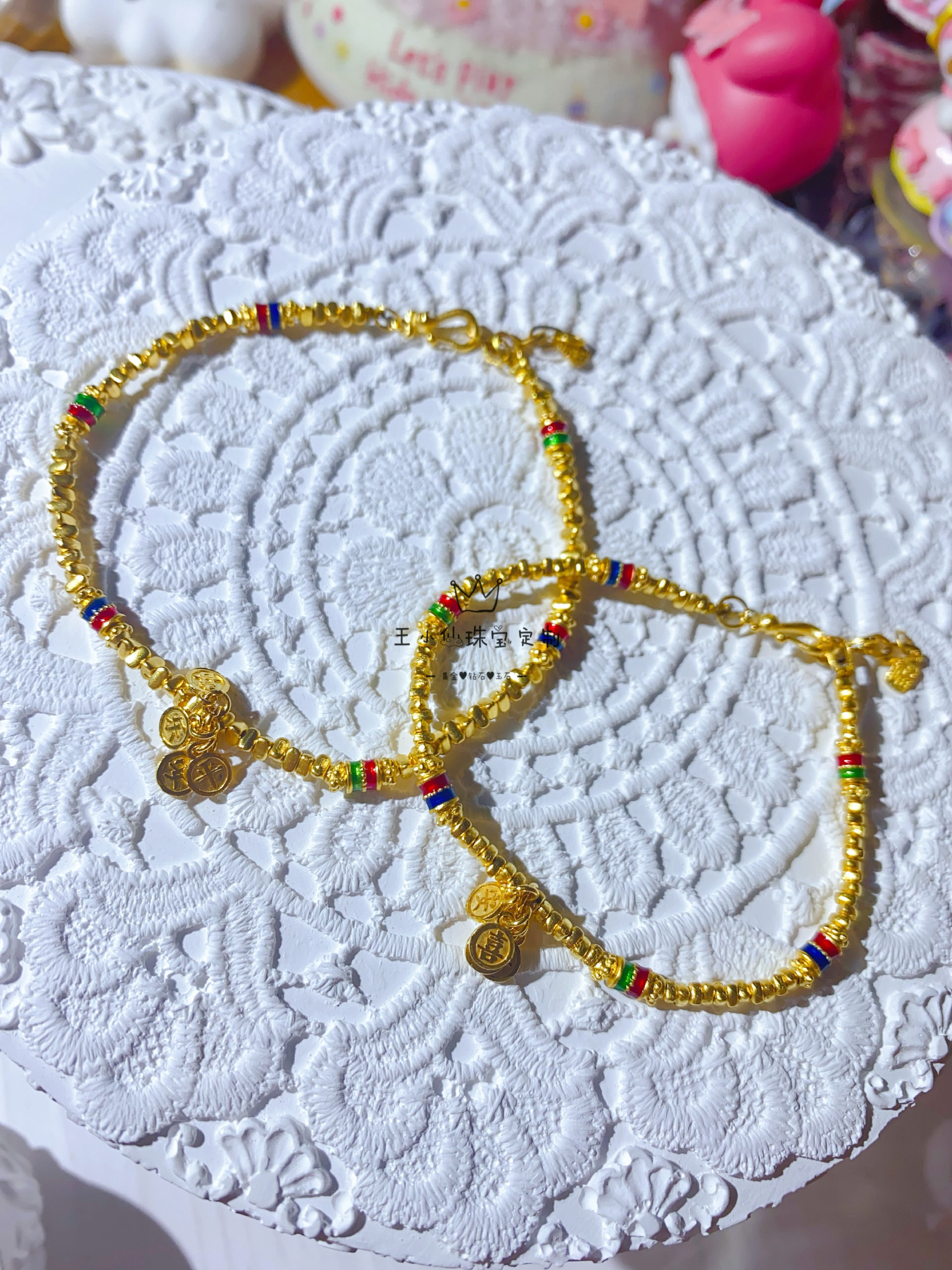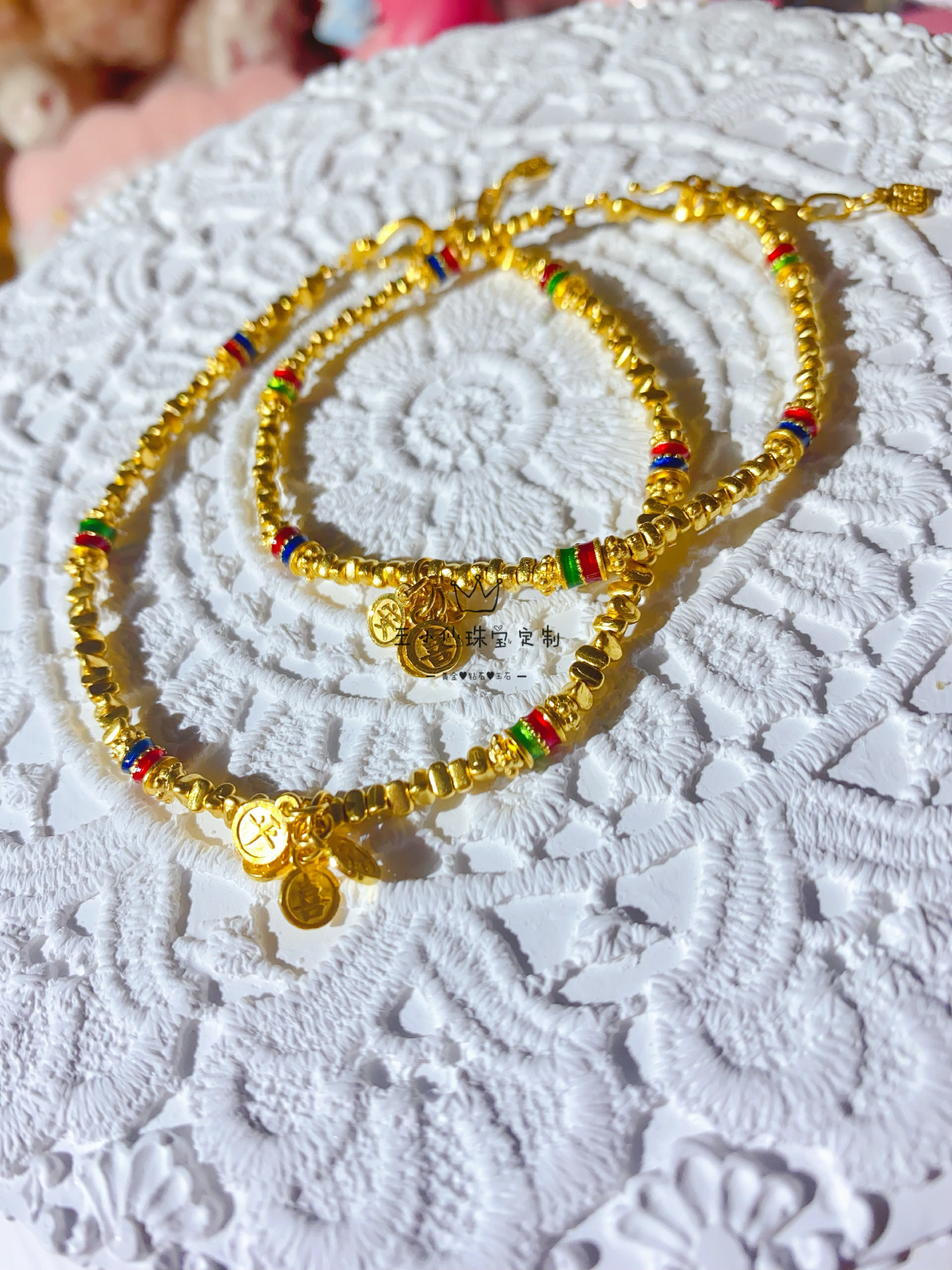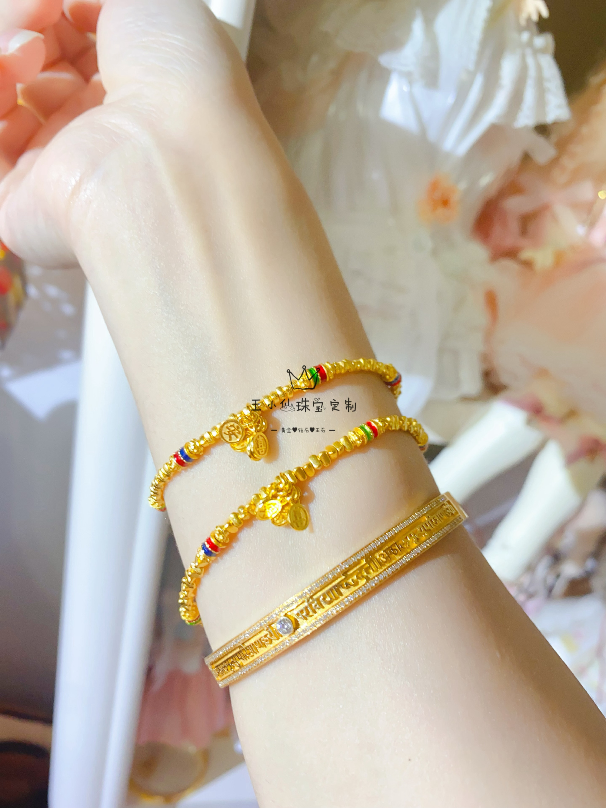 999足金手工古法金实心碎金岁岁平安高温烧蓝管平安喜乐黄金手链
