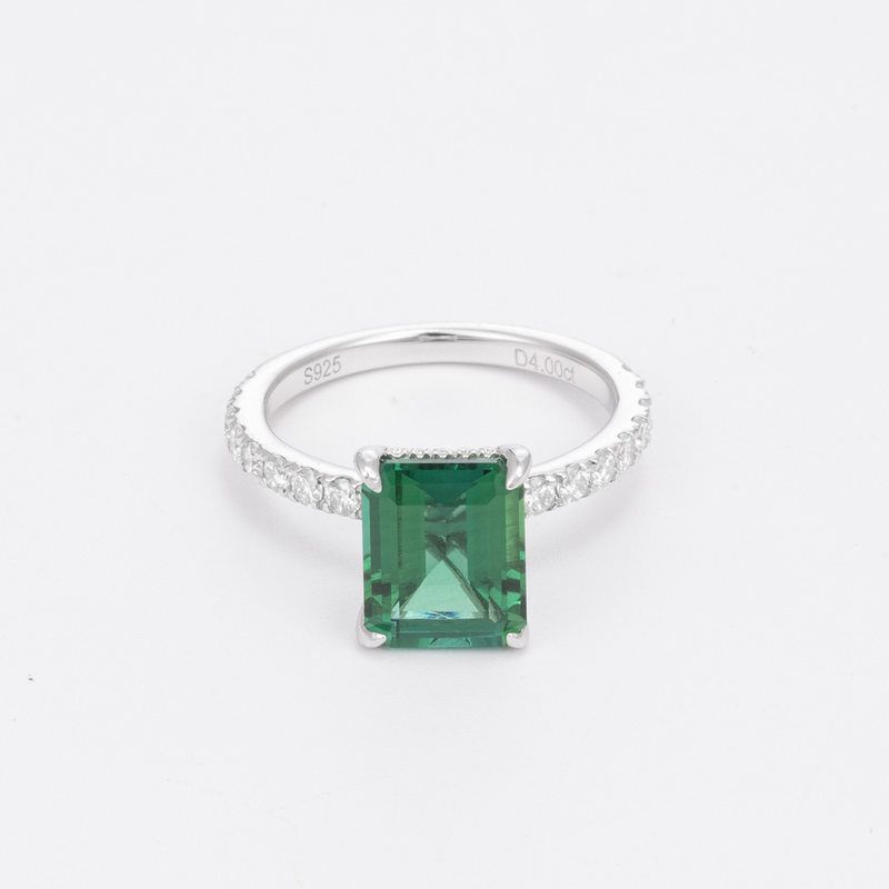 澄一S925纯银质感4克拉培育祖母绿宝石经典方钻订婚戒指生日礼物