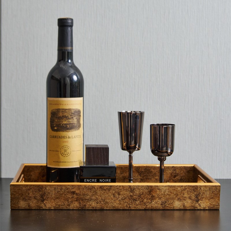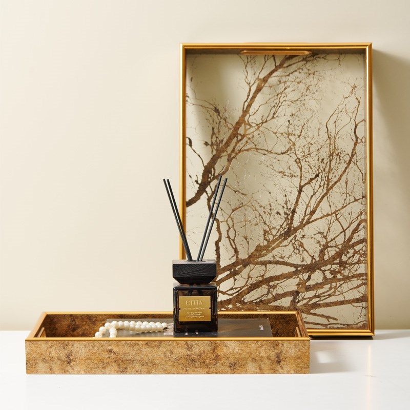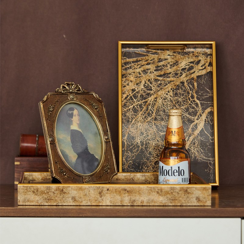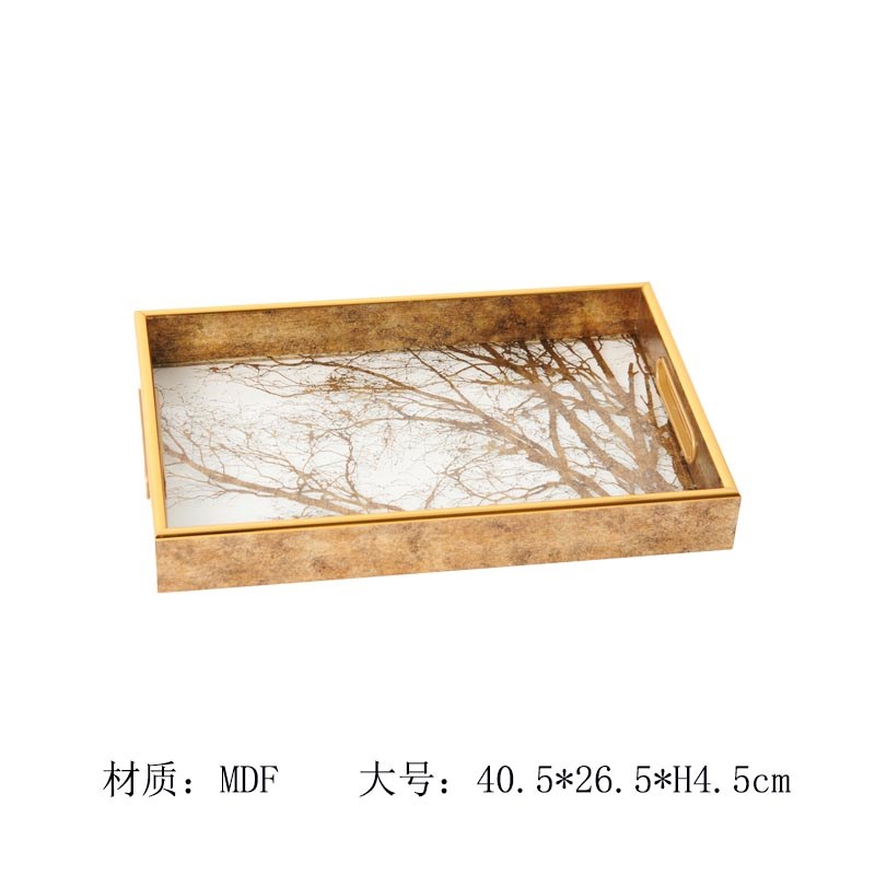 欧式轻奢金色长方形透p明底茂密树枝托盘摆件样板间客厅收纳盘装
