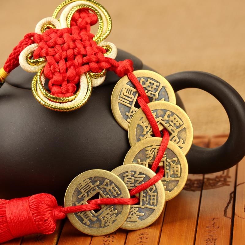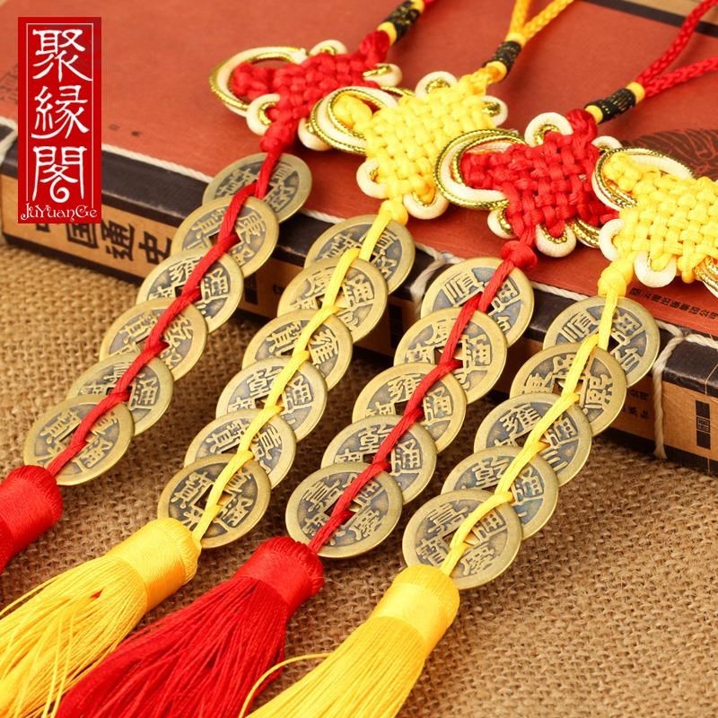 2021摆件黄线汽车饰品铜钱串精品五帝钱挂件手工古币五钱六帝中国