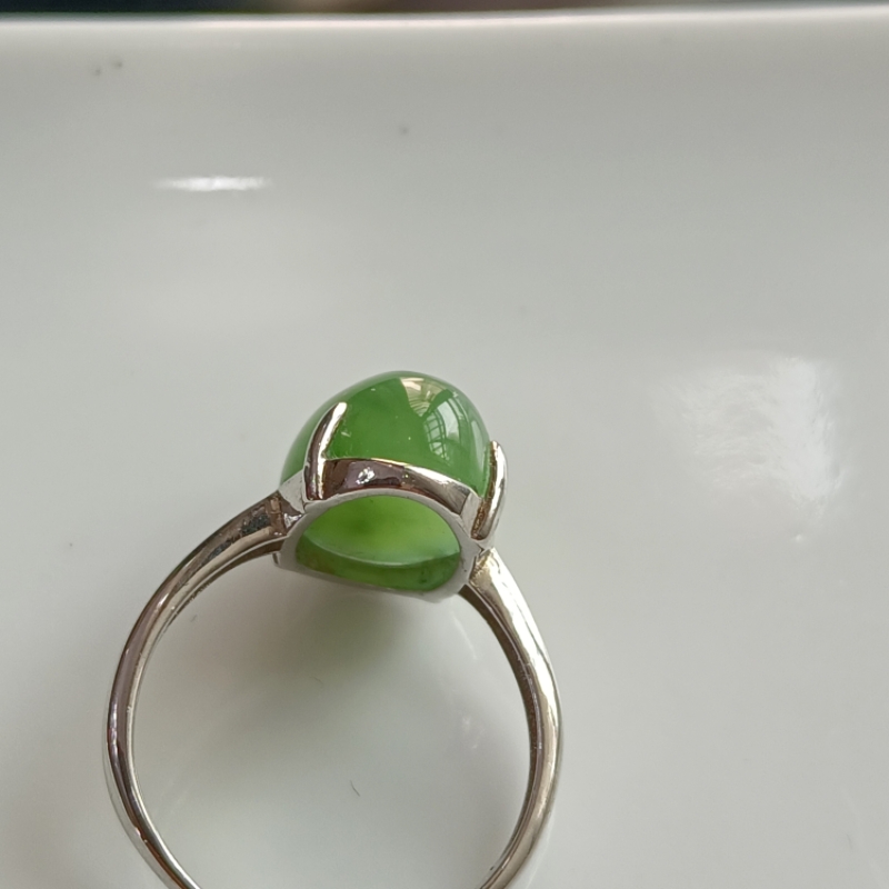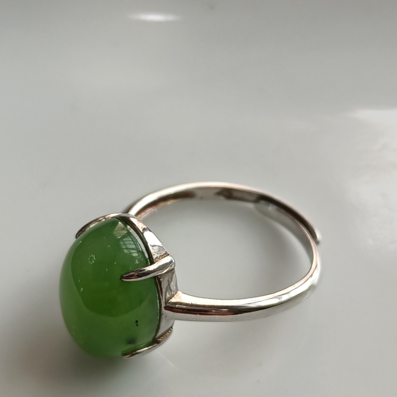 俄罗斯老坑和田玉碧玉戒指S925纯银镶嵌菠菜绿蛋面活口玉石指环