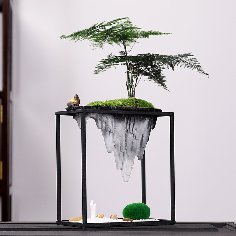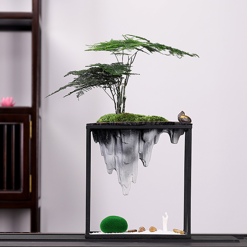 新中式客厅绿植盆栽摆件办公室桌面文竹植物盆景假山酒柜装饰摆设