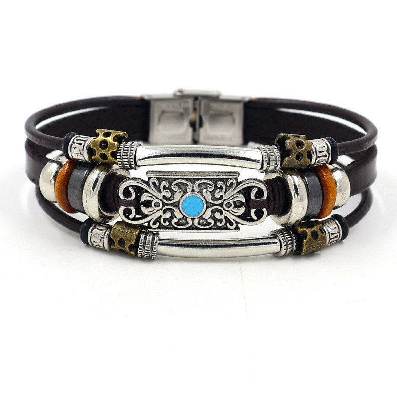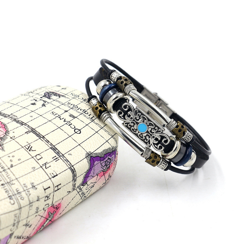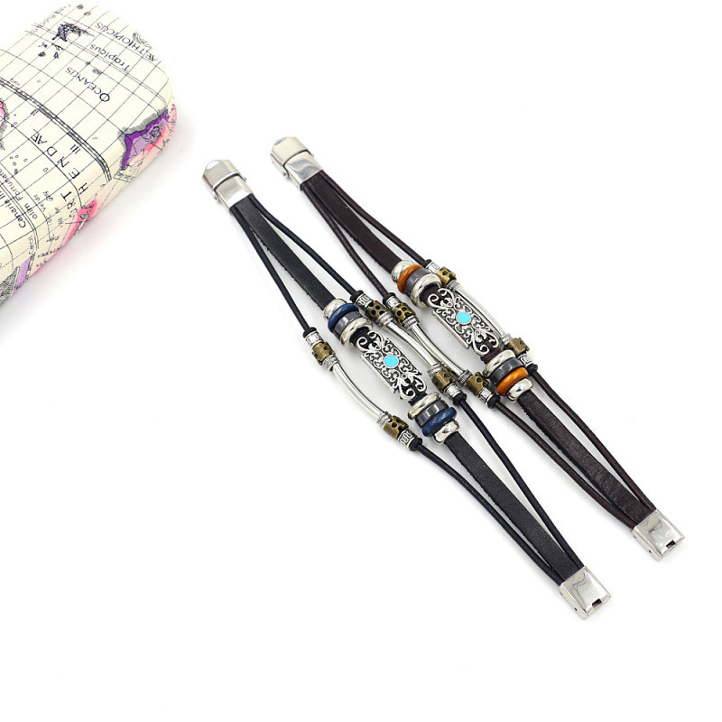 Temu热卖DIY手工编织皮绳手链复古合金多层串珠手镯情侣饰品