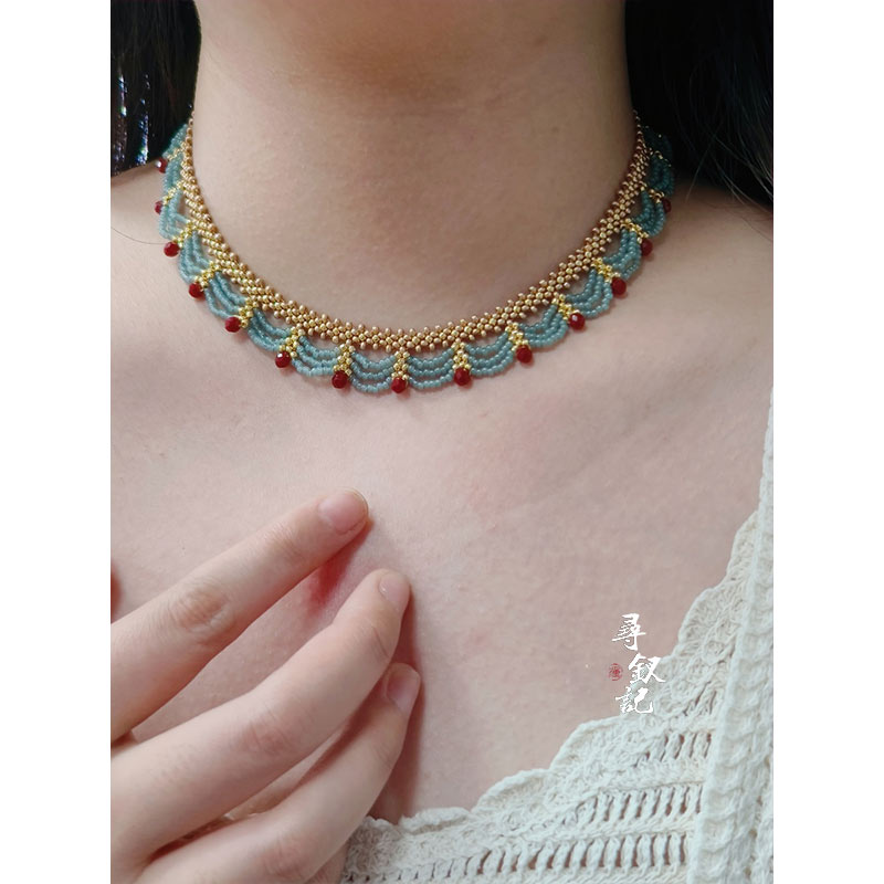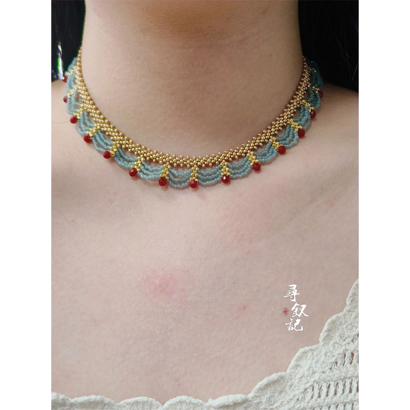 新款气质流苏多层蕾丝红蓝撞色串珠项链简约优雅时尚高级感锁骨链