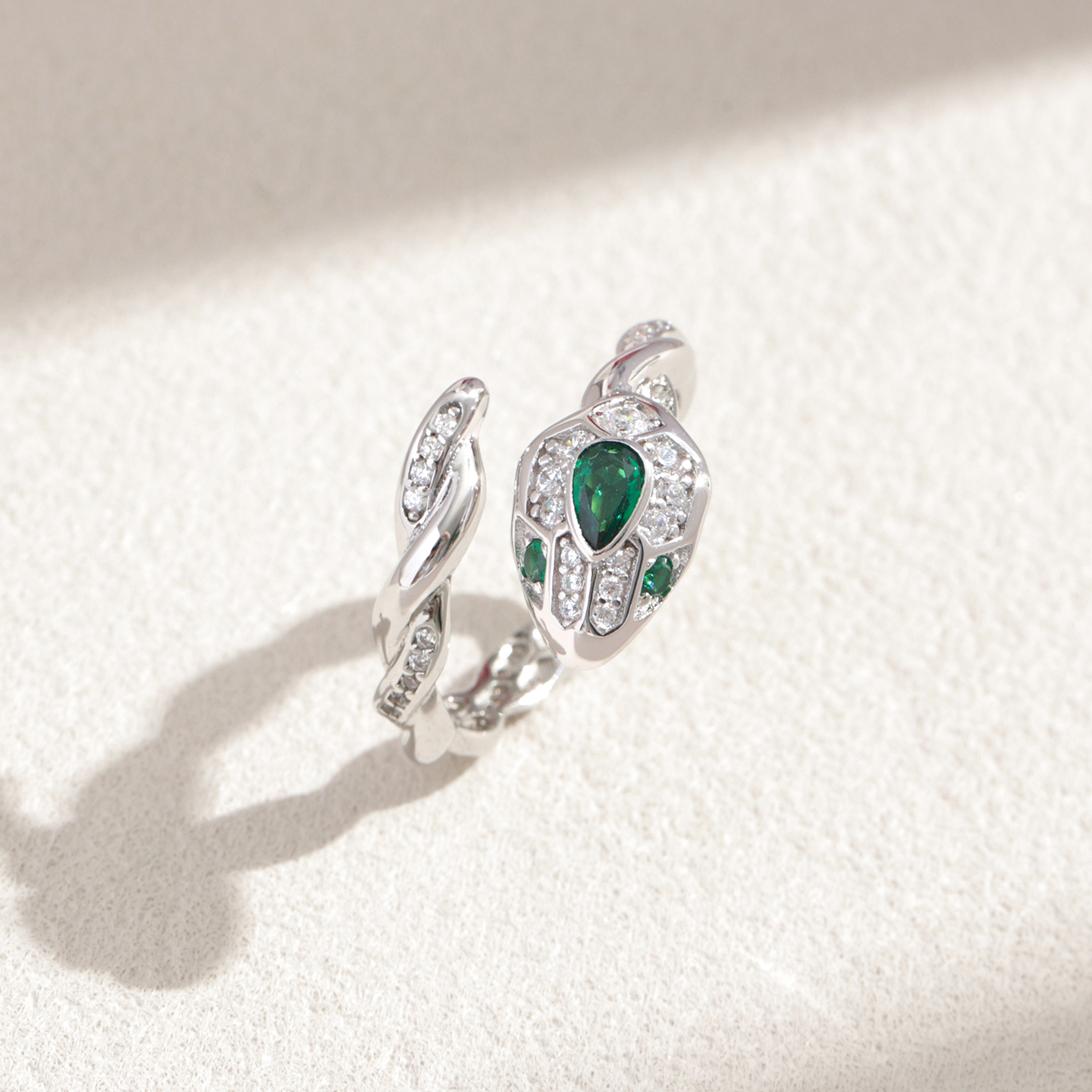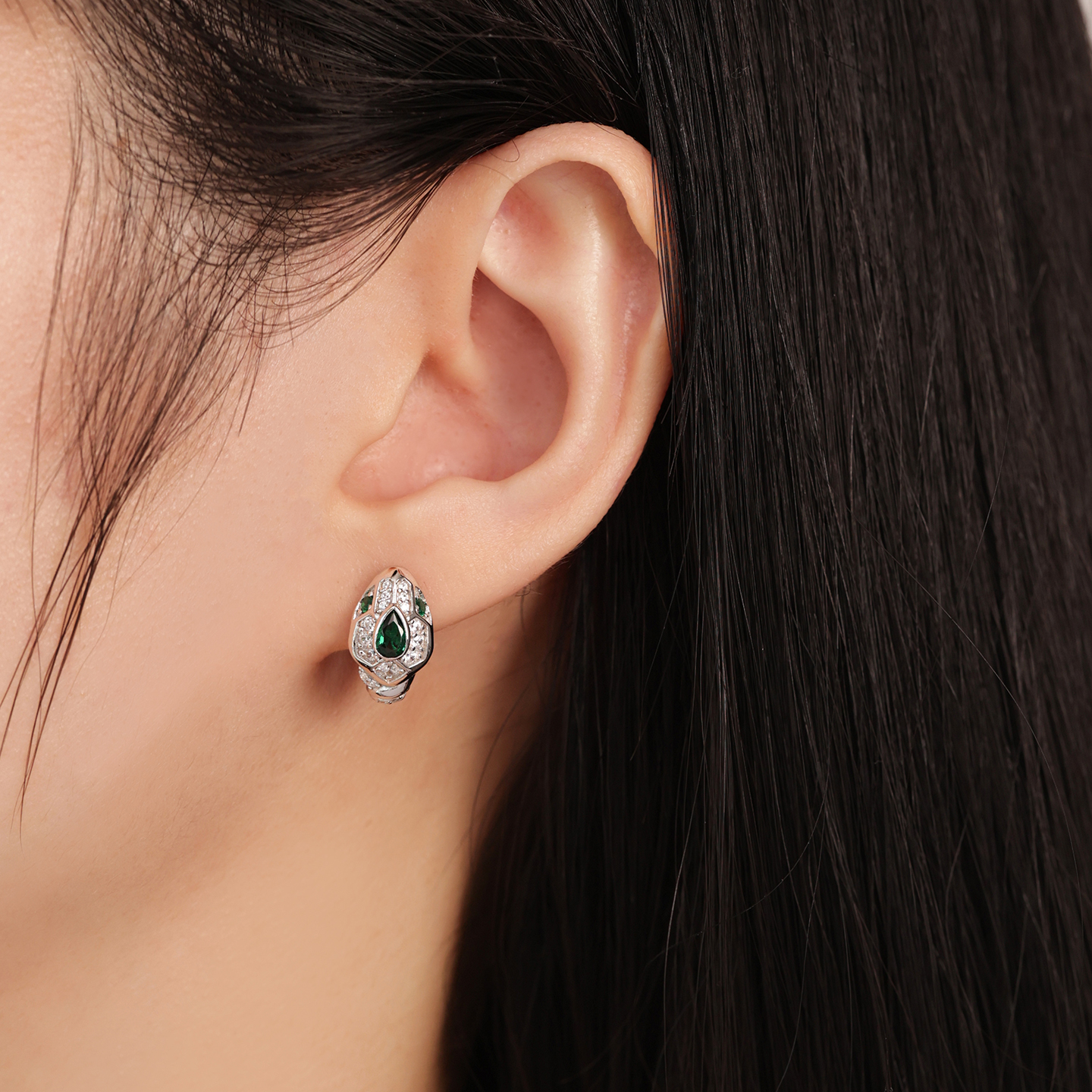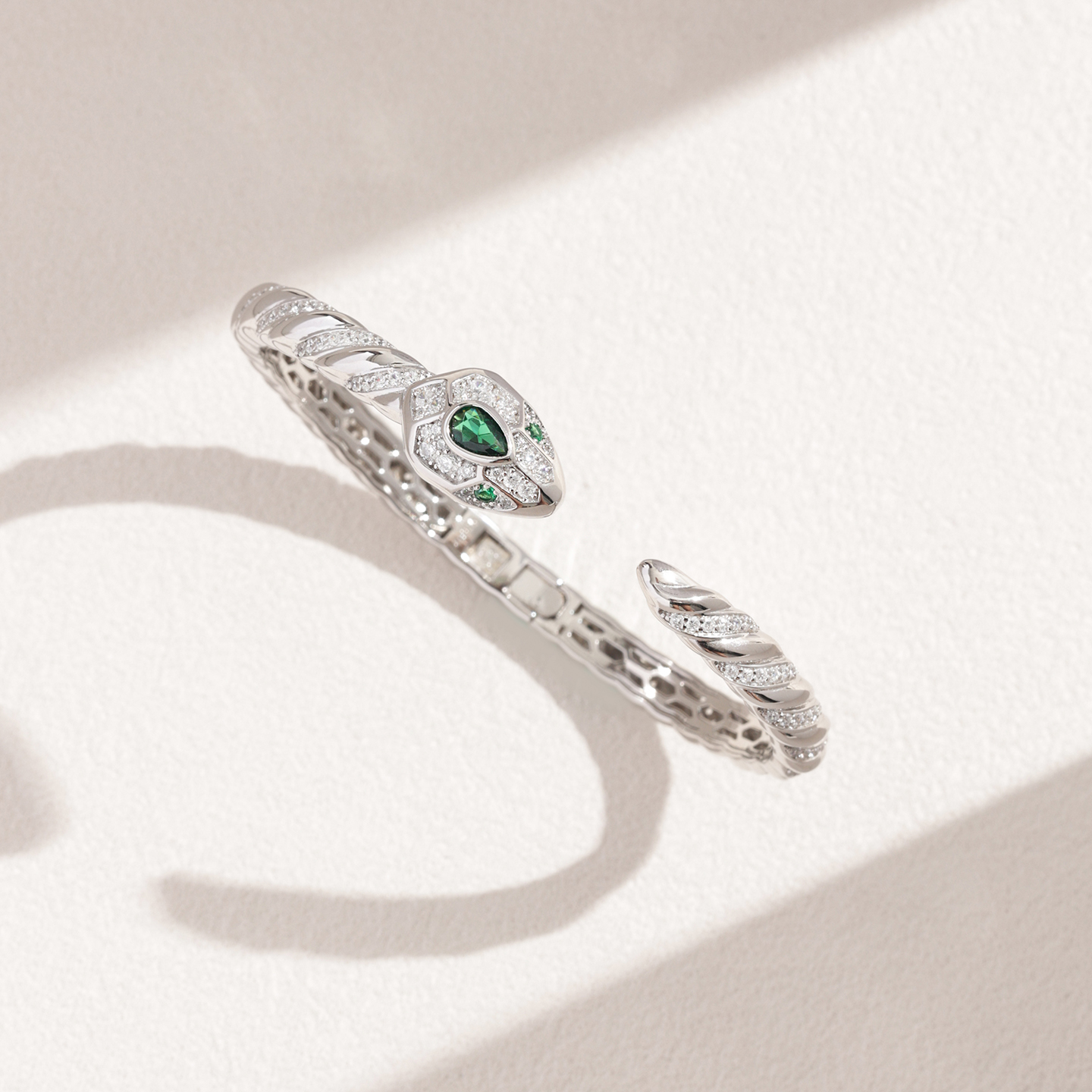 幸运灵蛇系列祖母绿色镶钻吊坠开口戒指轻奢纯银耳环奢华宽版手镯