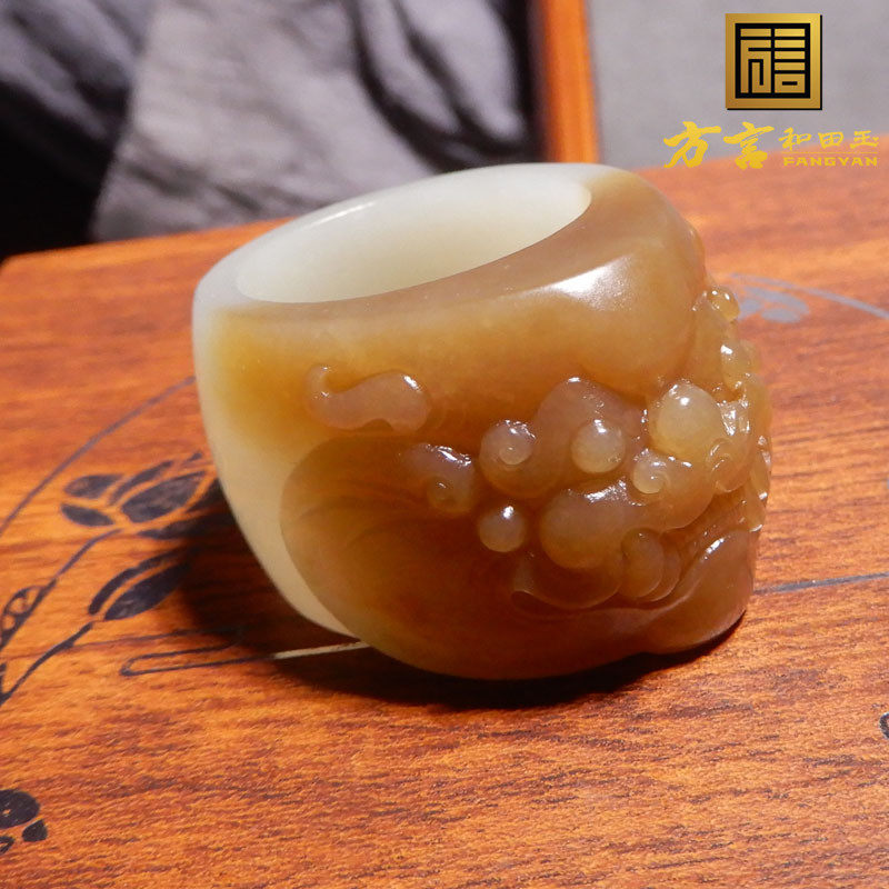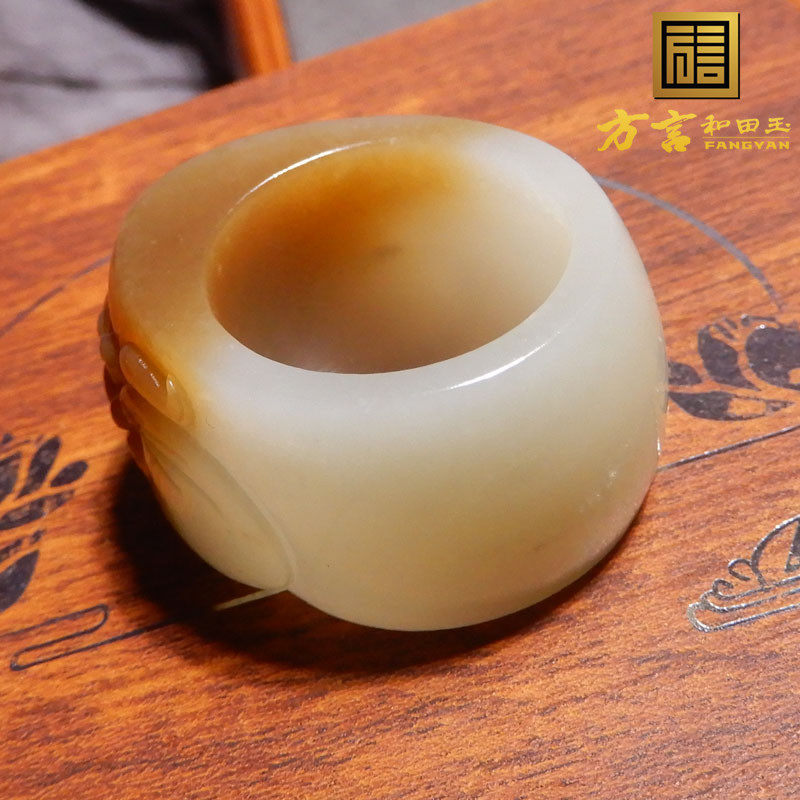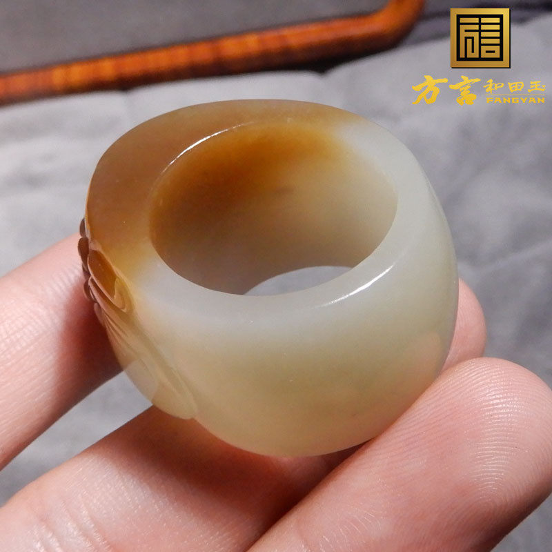 珍品级新疆且末金山矿老熟黄金糖羊脂白玉兽面守护扳指22mm戒指R3