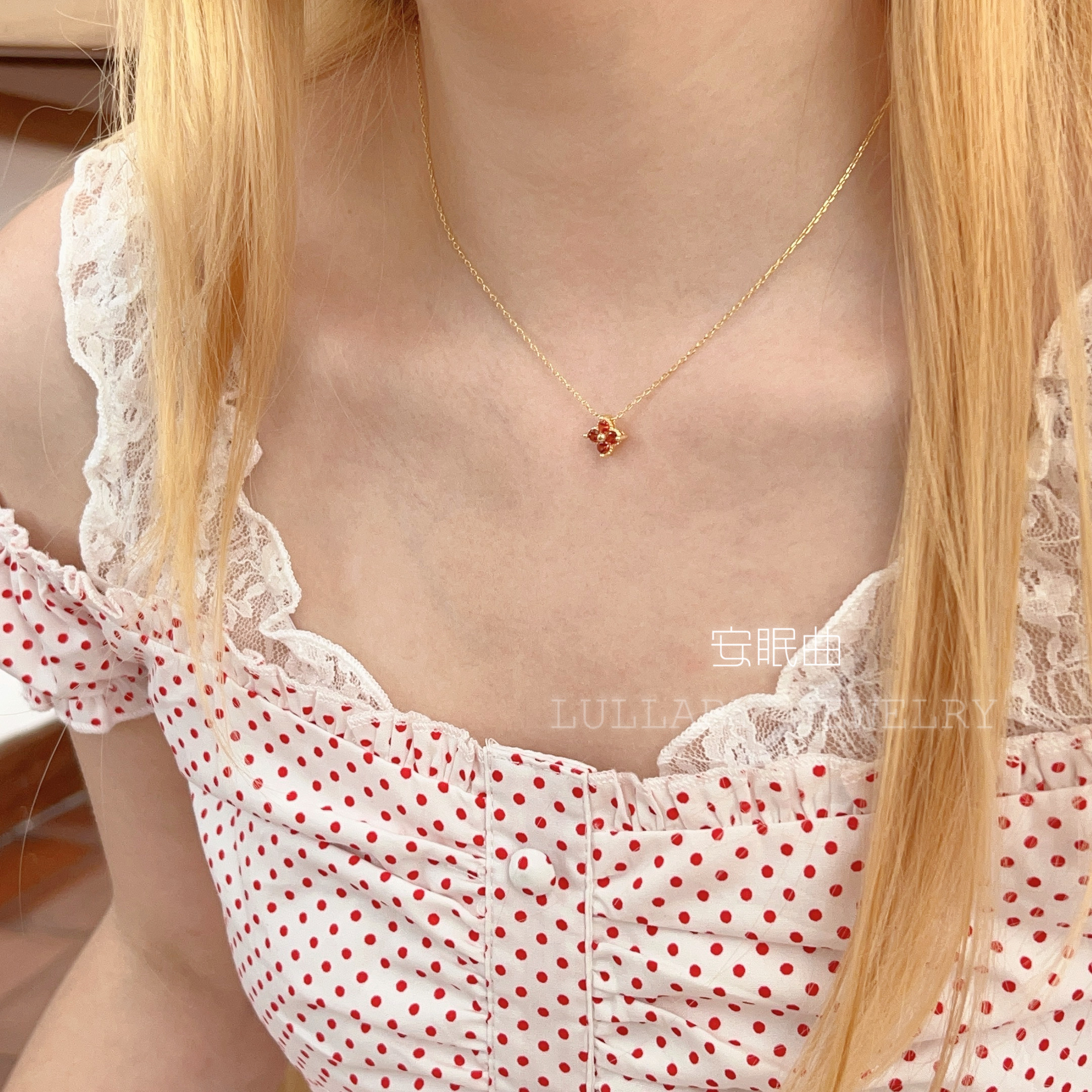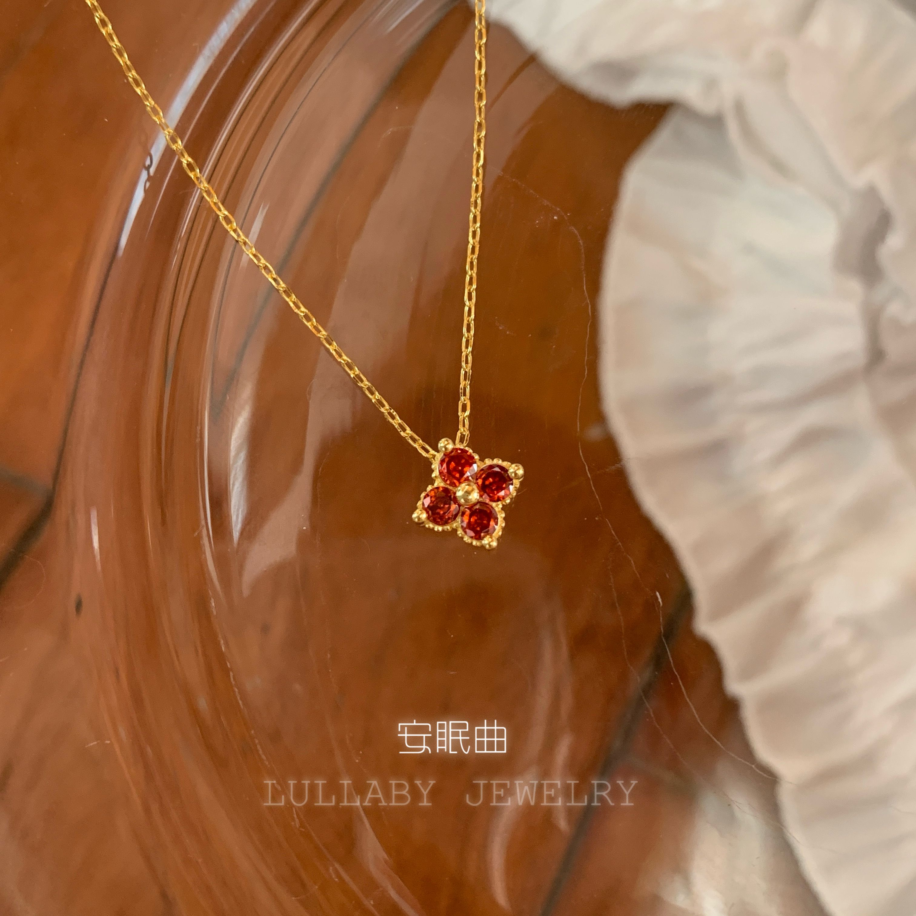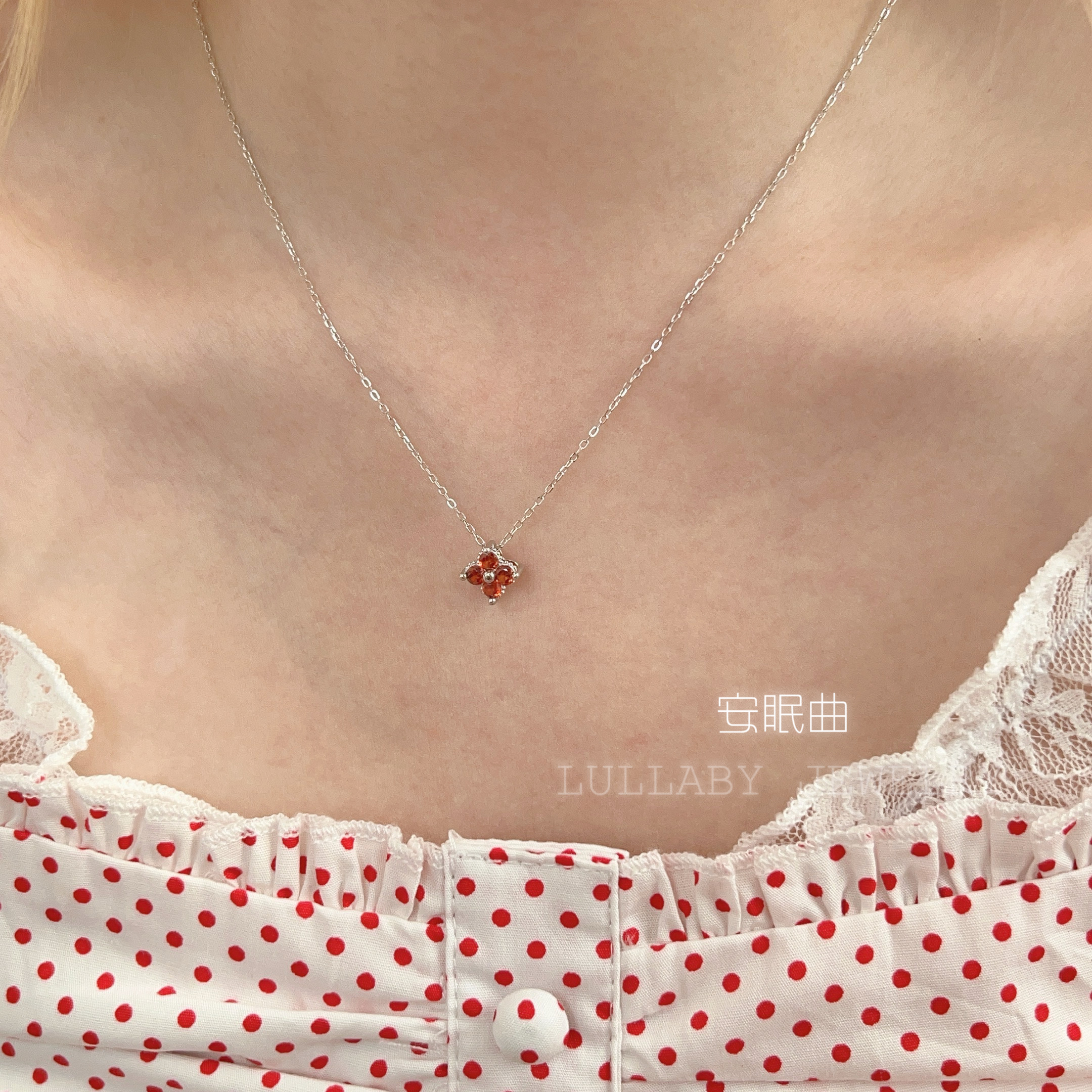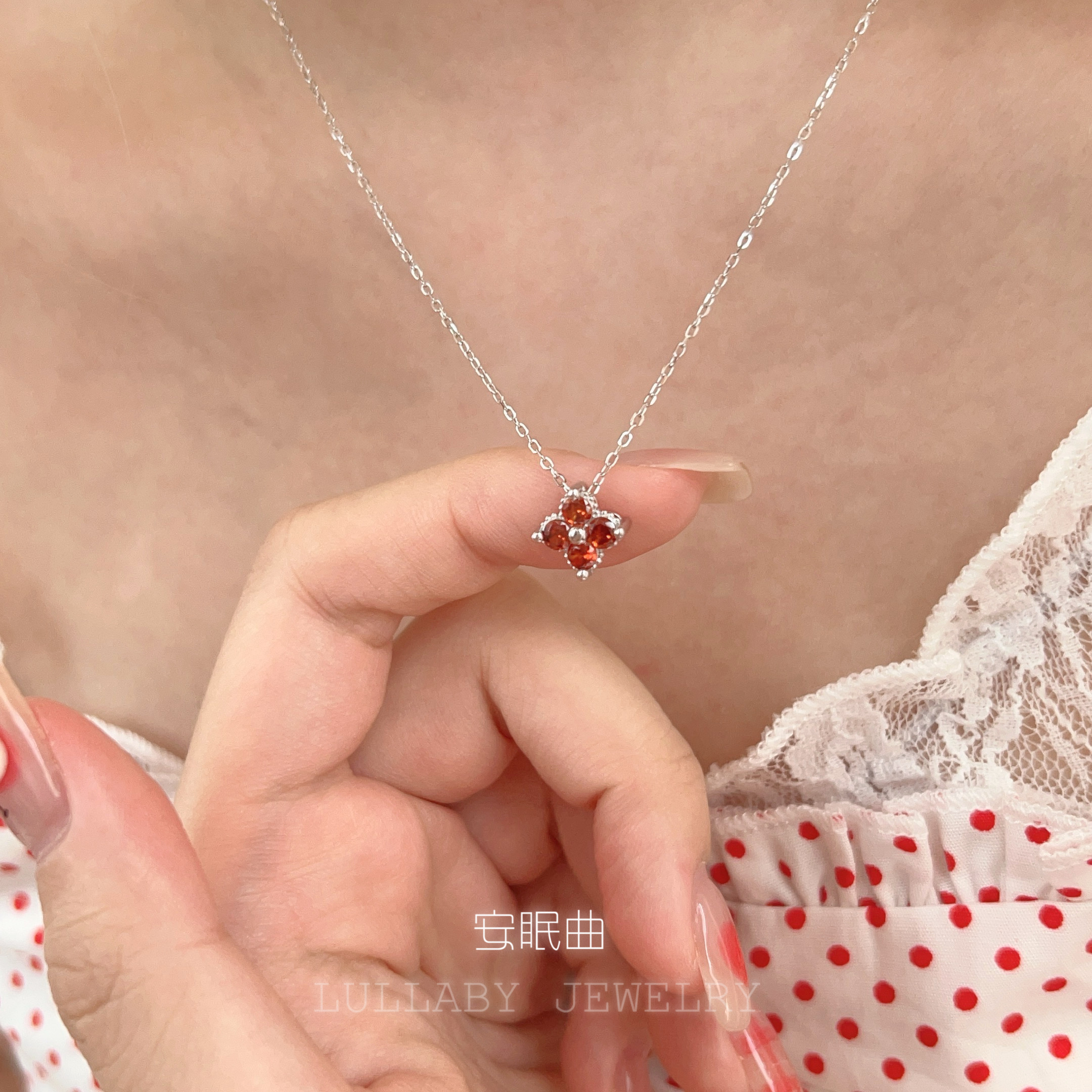 七月生辰石!幸运加成!s925纯银四叶草项链女红色锆石小众锁骨链