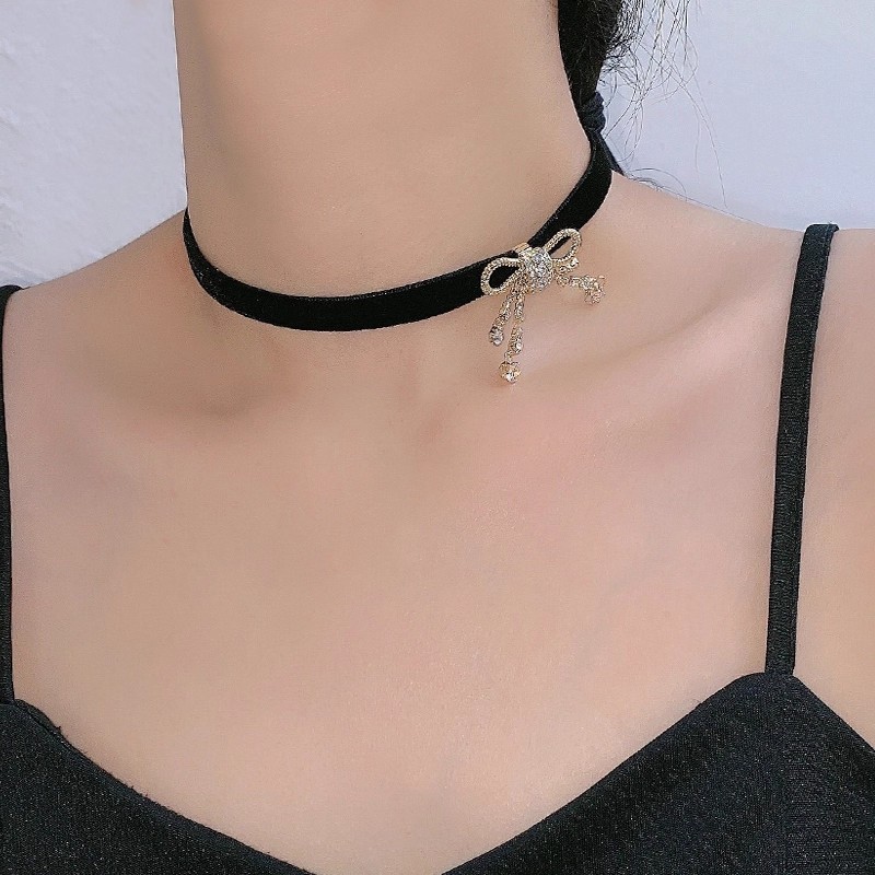 复古轻奢黑色丝绒镶钻蝴蝶结项链女小众设计choker百搭颈带锁骨链