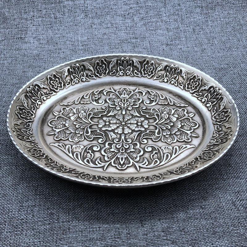 仿古白铜镀银龙凤碟子笔洗盘子银碗款宣字底套装复古雕花椭圆摆件