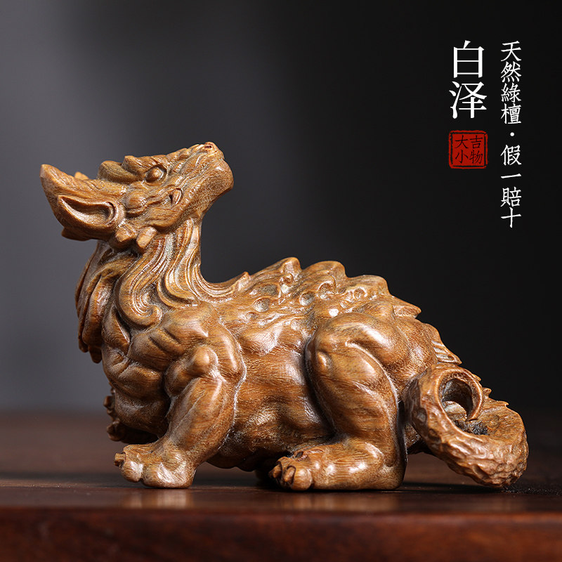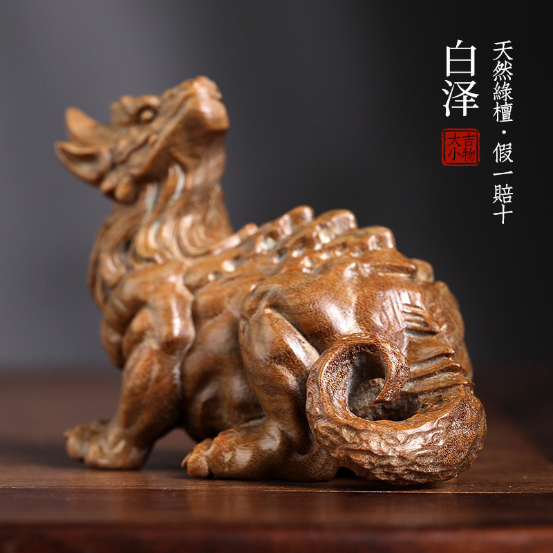 天然绿檀木实木雕刻白泽摆件文玩手把件家居装饰品工艺品