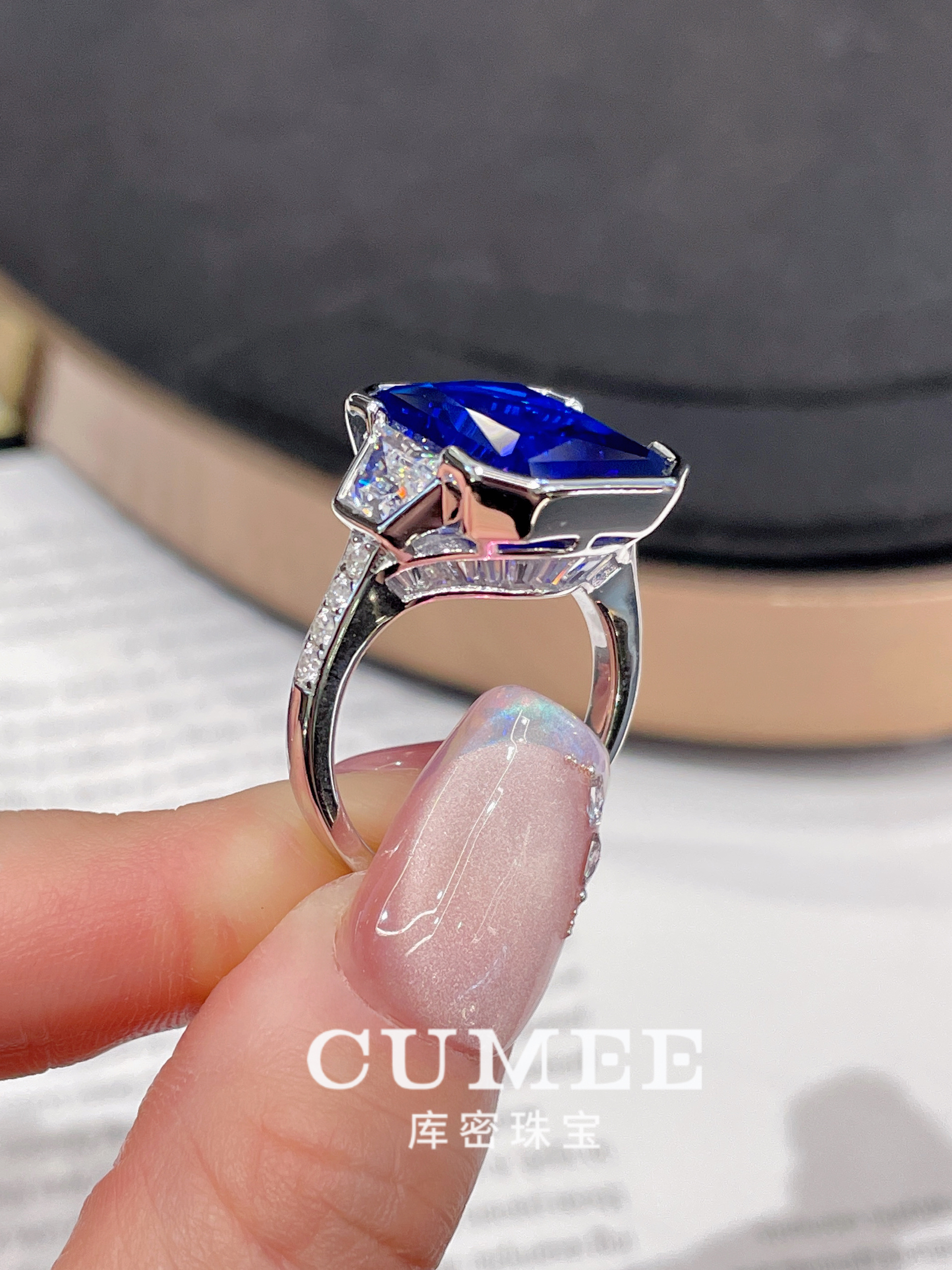 大克拉霸气T方切割10卡男款培育合成蓝宝石戒指.银镀金