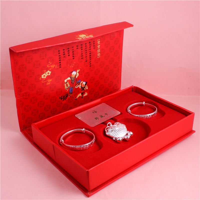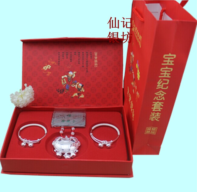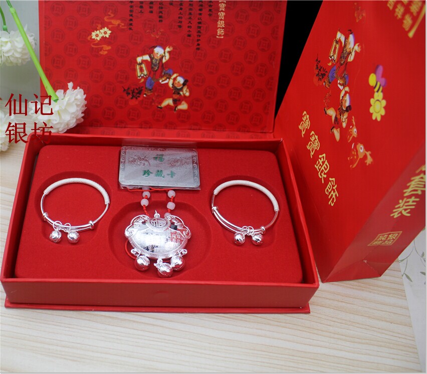 银饰品 S999 足银小孩手镯长命锁 出生宝宝满月百天纯银套装礼盒