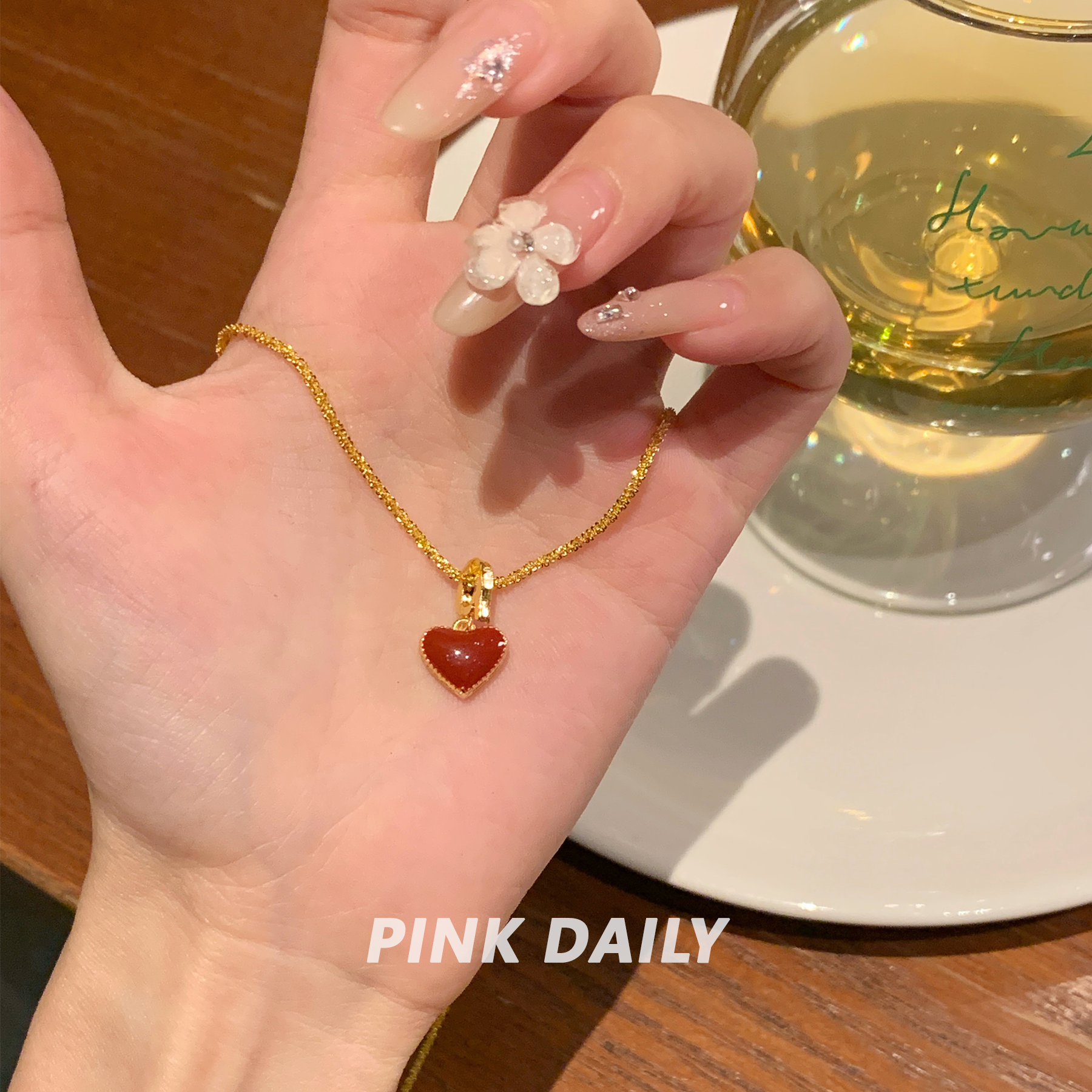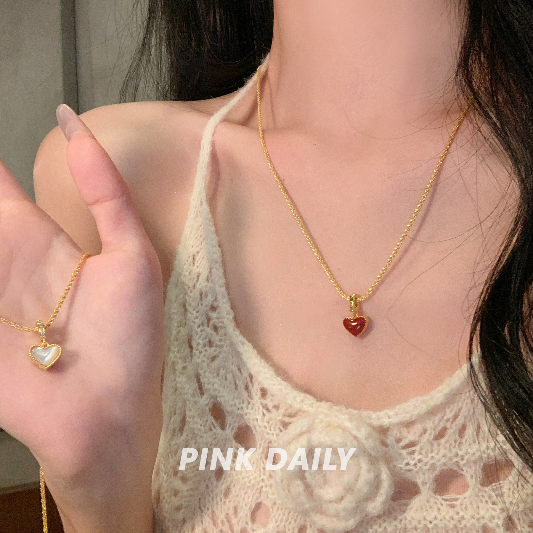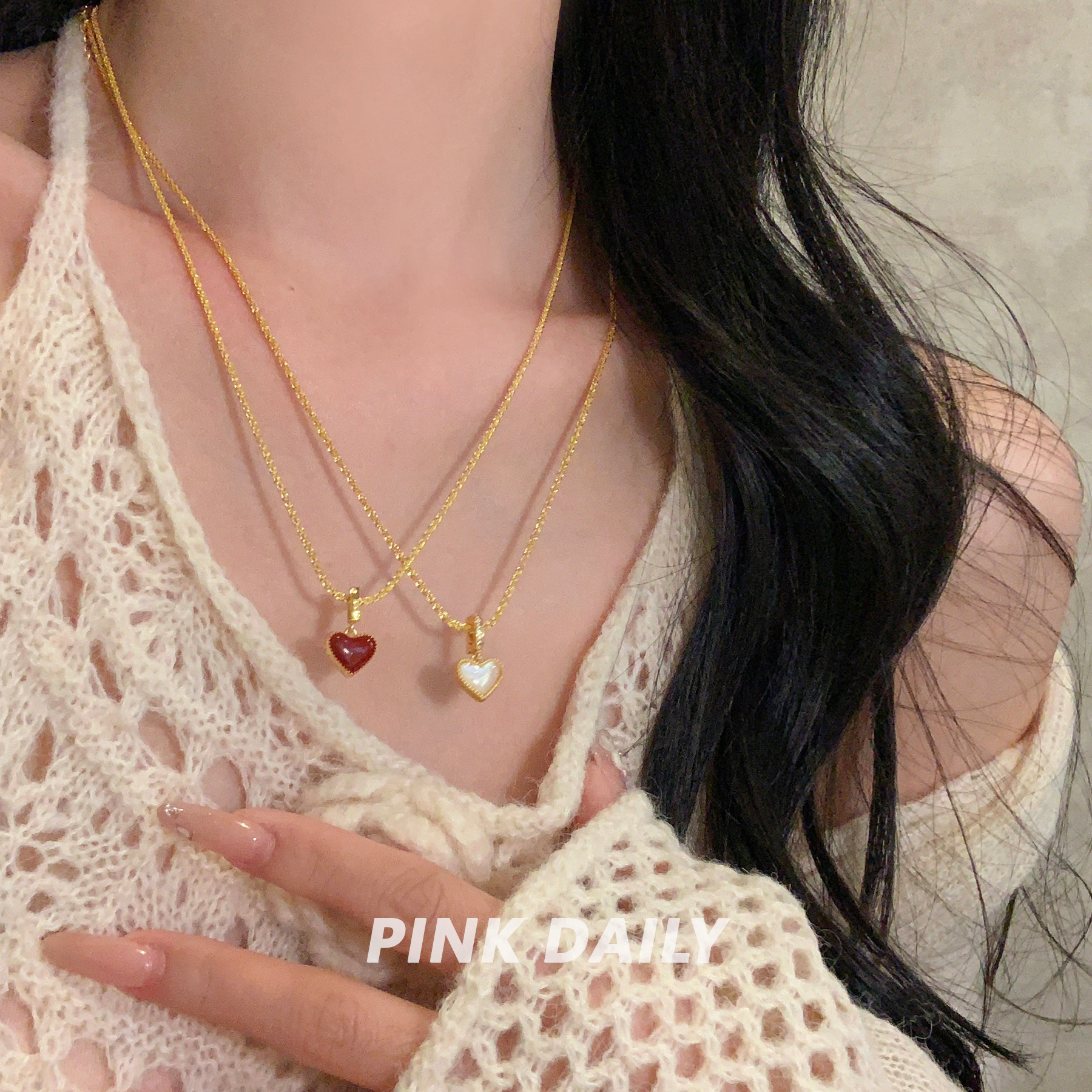 Pink Daily红色双面贝母爱心吊坠钛钢项链女简约锁骨链装饰毛衣链
