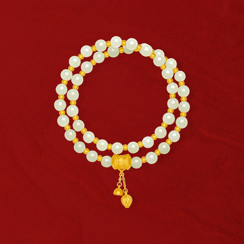 周六福金镶玉5D硬金和田青玉新中式春风晓手串藏金文玩节日礼物