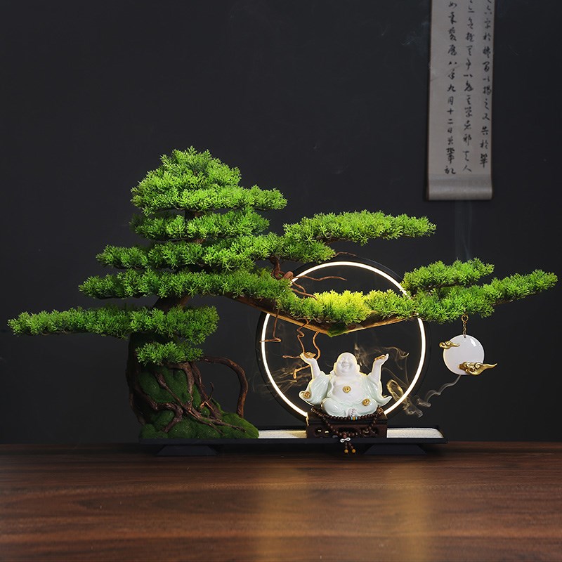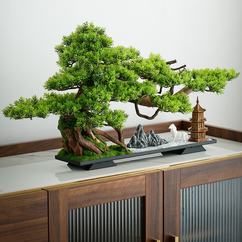 中式客厅盆景仿真迎客松绿植造景摆件办公室室内W盆栽玄关桌面
