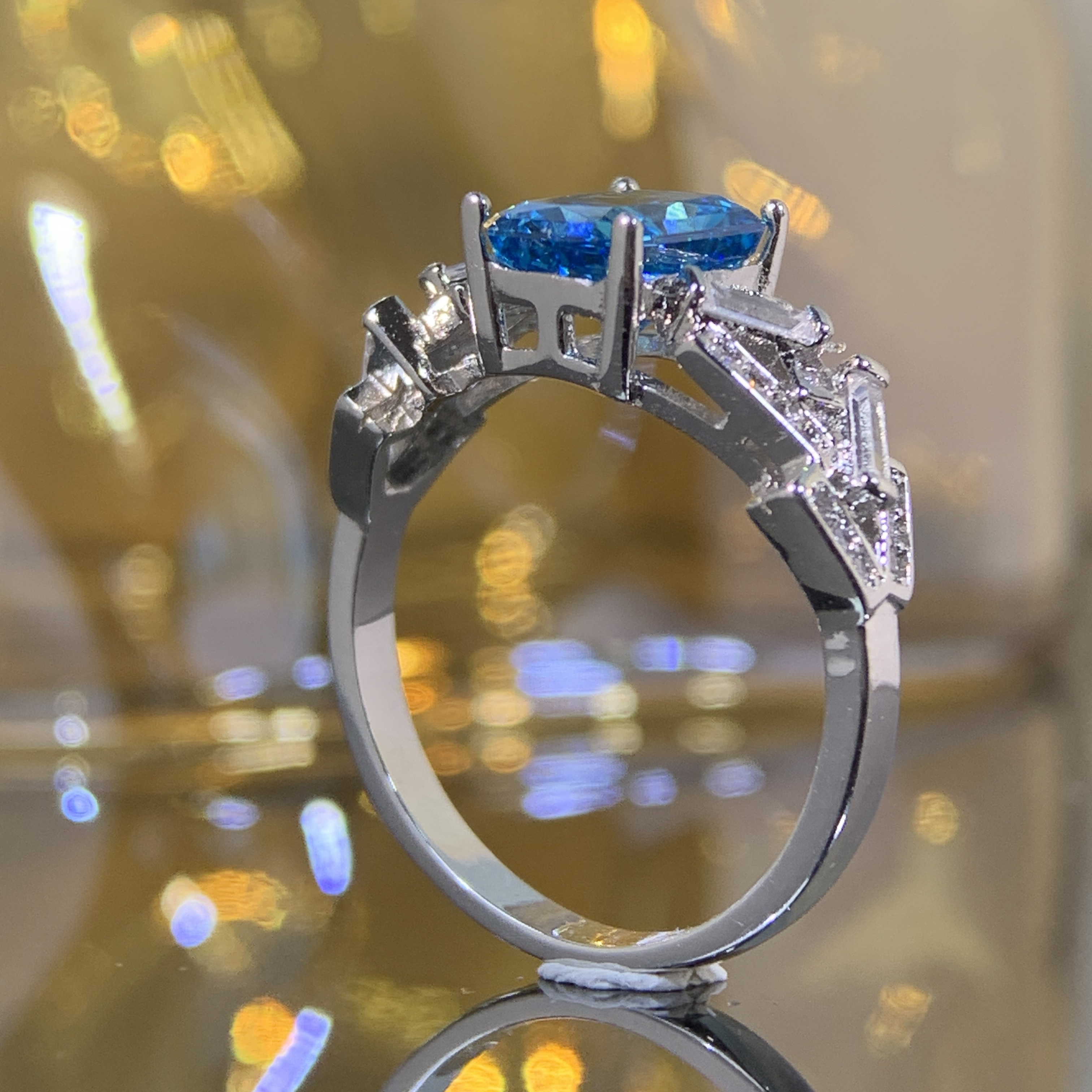 培育冰花切镶嵌海蓝色2克拉戒指精工厚镀18K金不掉色6*8长方钻戒