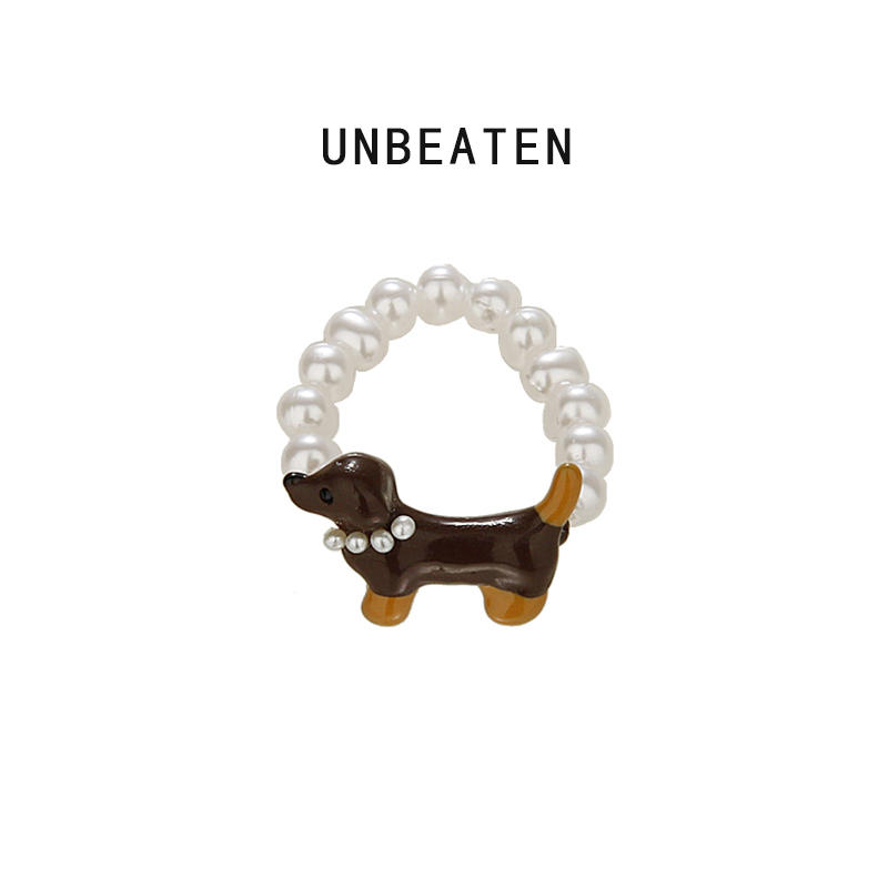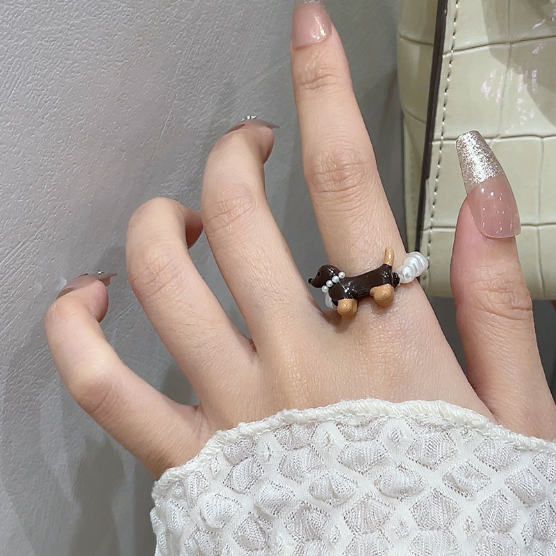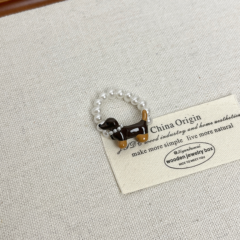 咖色腊肠狗珍珠戒指女秋冬可爱卡通高级感食指戒2025新款精致指环