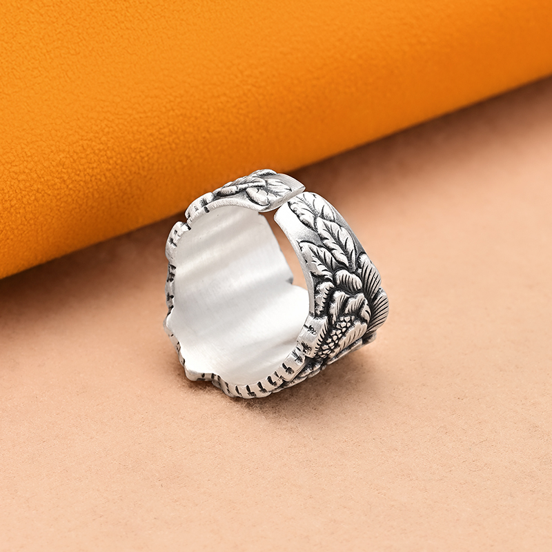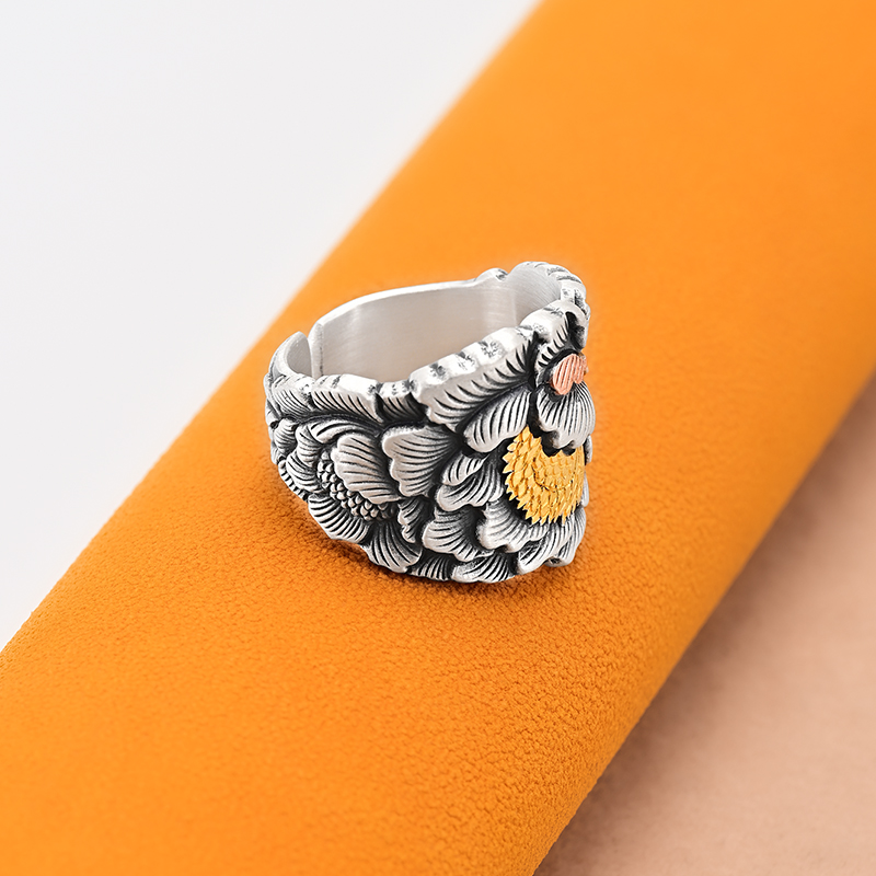 花韵复古手饰足银999手工精工牡丹镶金传承戒指开口女式指环錾刻