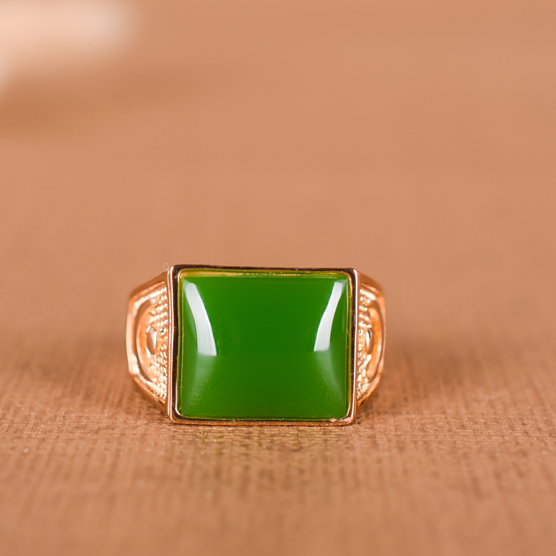 和田玉碧玉方形戒指 925银镶嵌玉石戒指男款银镶玉指环活口可调节