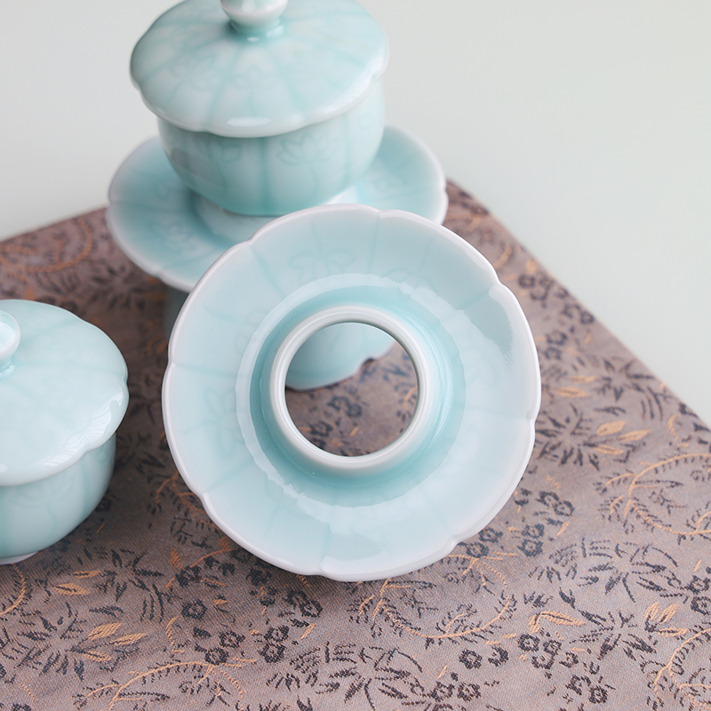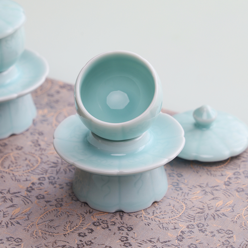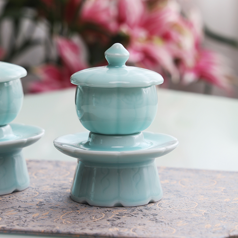 青瓷带托圣水杯供水陶瓷佛前水杯佛具用品莲花观音供水供奉小茶杯