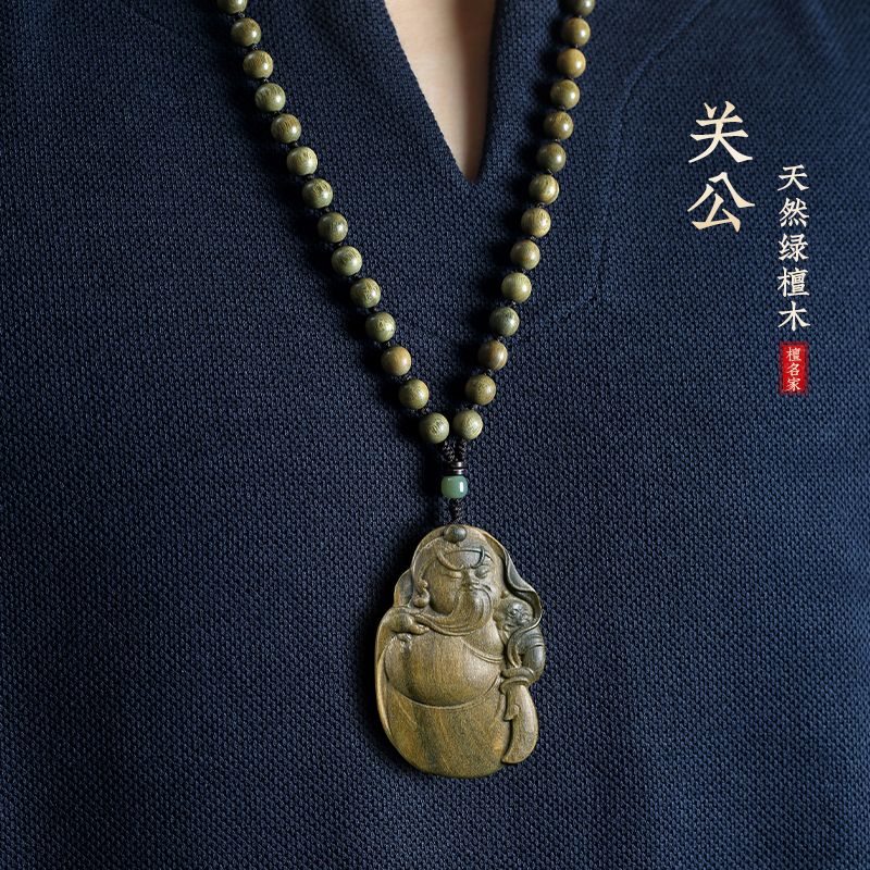 绿檀木关公吊坠木质项链佛牌财神爷把玩件毛衣链关二爷车挂钥匙扣
