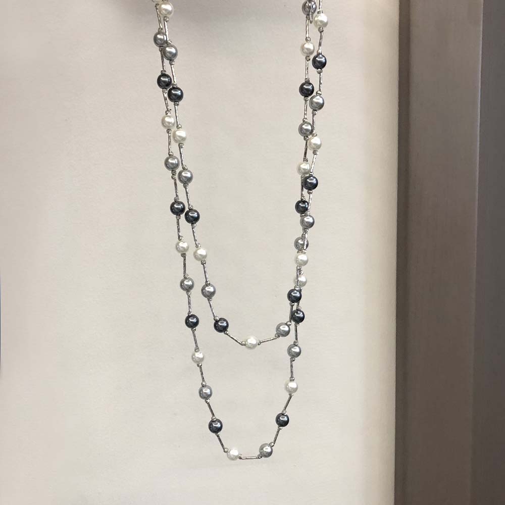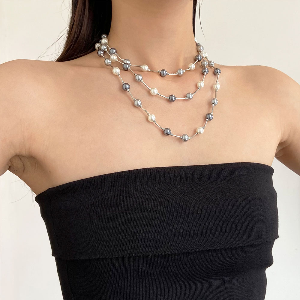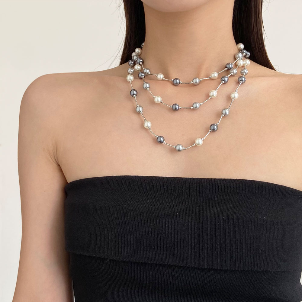 欧美新款黑白灰色珍珠拼接项链女多层叠戴长款锁骨链高级感毛衣链