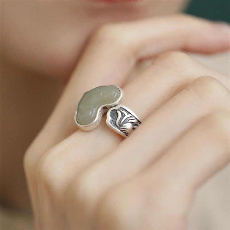 925银a新中式复古做旧民族风和田玉如意戒指环开口调节简约高级感
