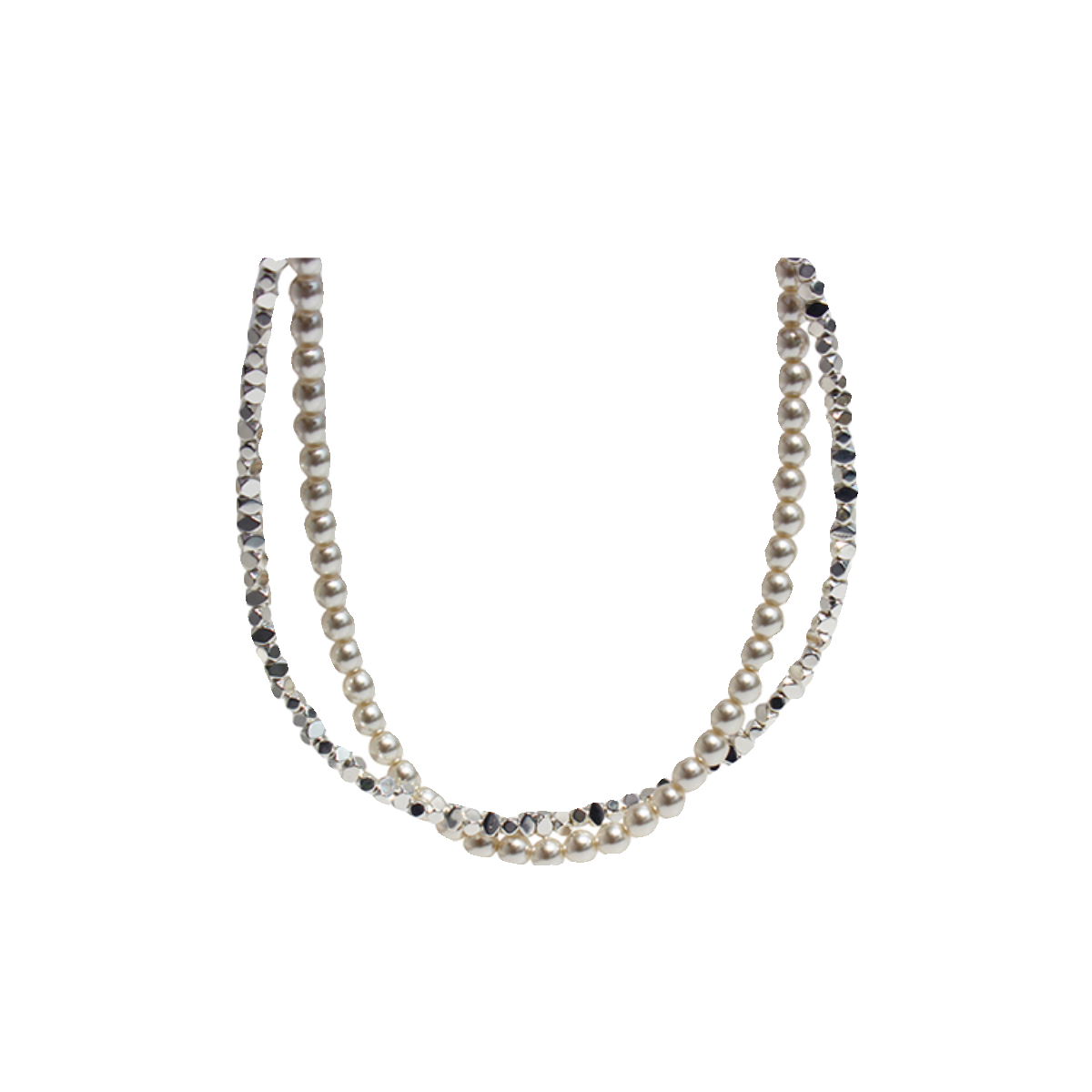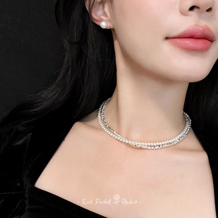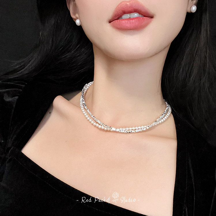红口袋 法式复古珍珠碎银子项链锁骨链清冷超闪镀金缠绕双层项链