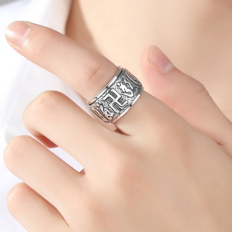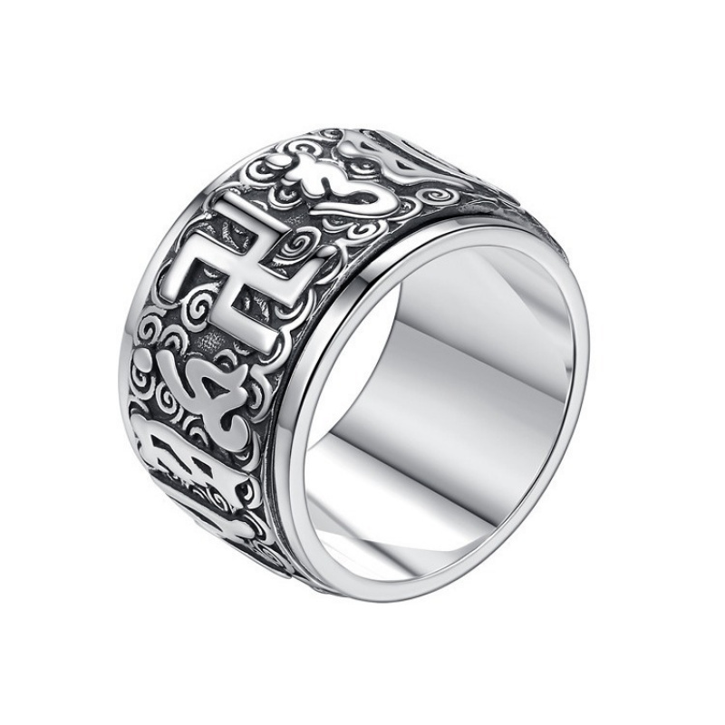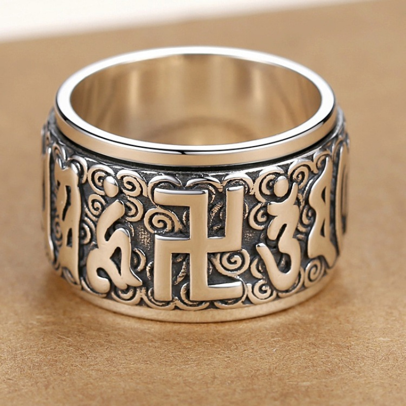 【新年转运】925纯银男士戒指潮小众六字真言可转动复古泰银大码