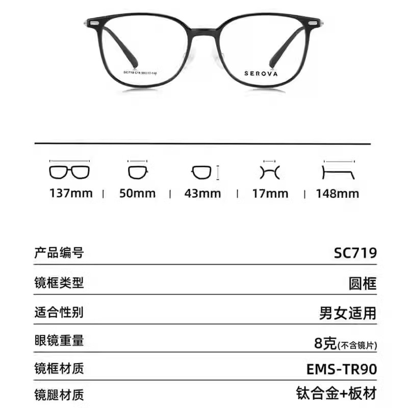 施洛华超轻β钛眼镜框SC719圆脸TR90男近视防蓝光眼镜架女配镜片