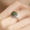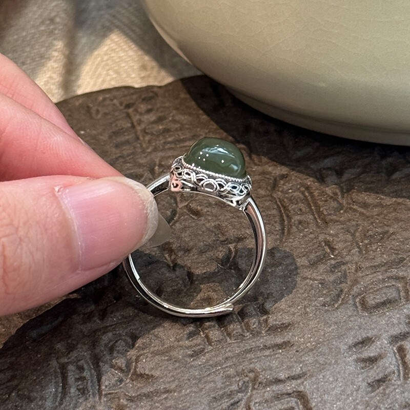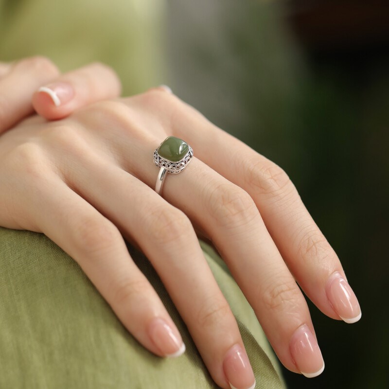925银复古新中式唐草纹方形戒指环开口调节和田碧玉轻.奢简约高级
