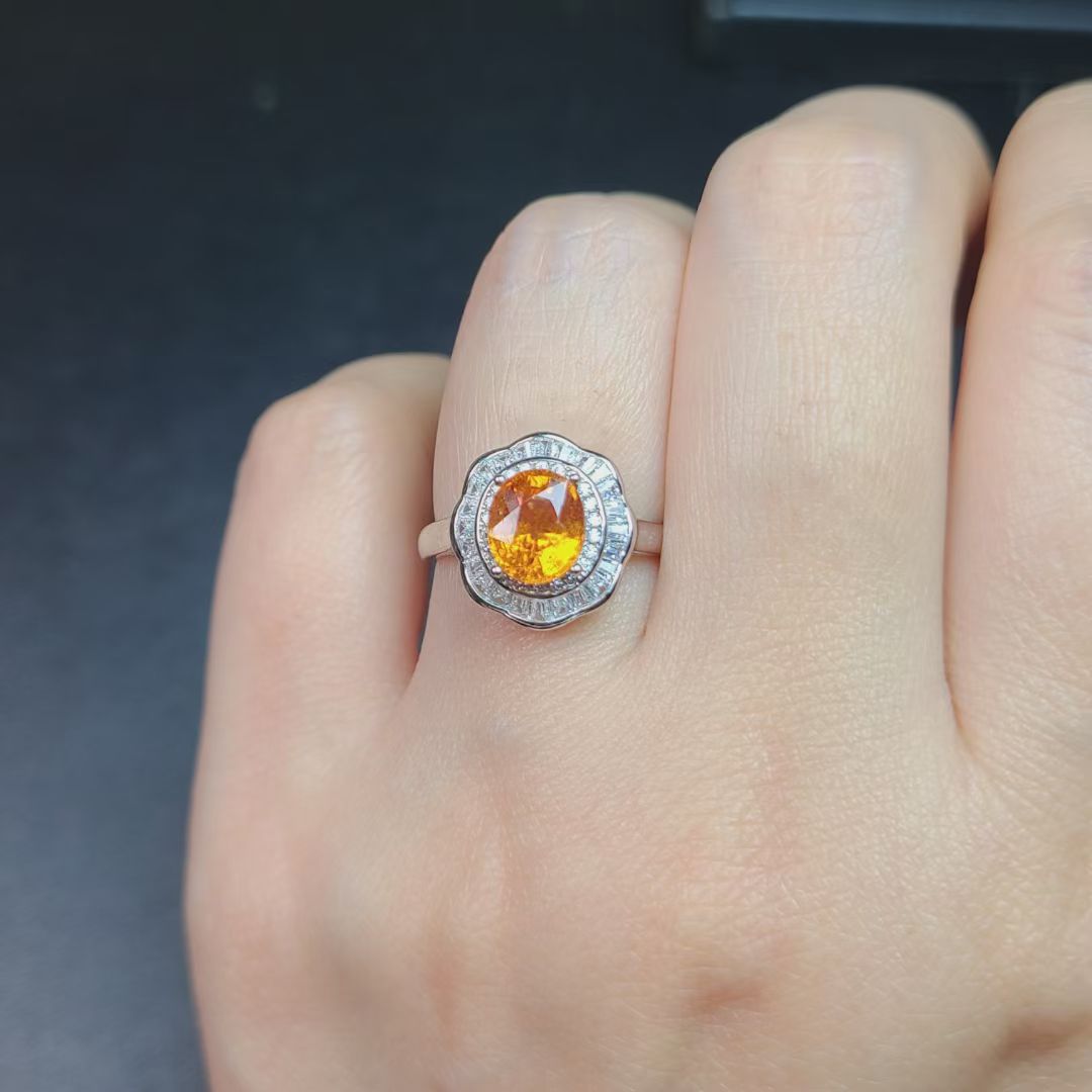 芬达石戒指天然重量1.88克拉亮丽的明橙色精工梯方镶嵌