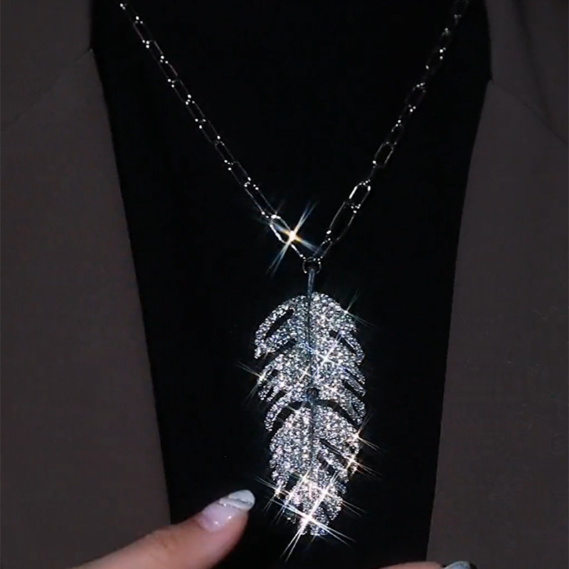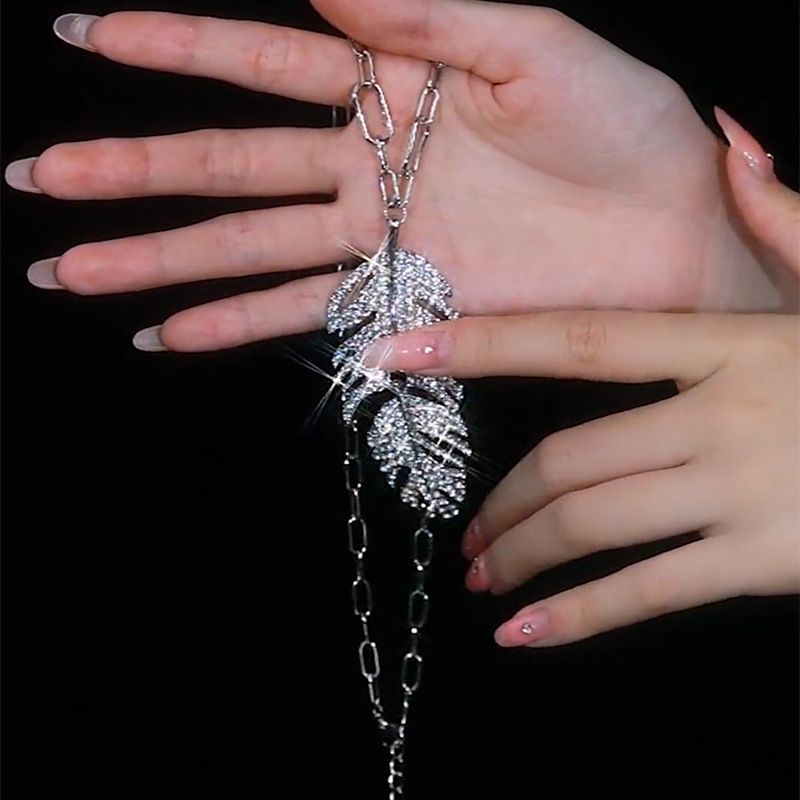 超闪镶钻树叶项链欧美时尚夸张小众羽毛毛衣链个性气质设计感轻奢