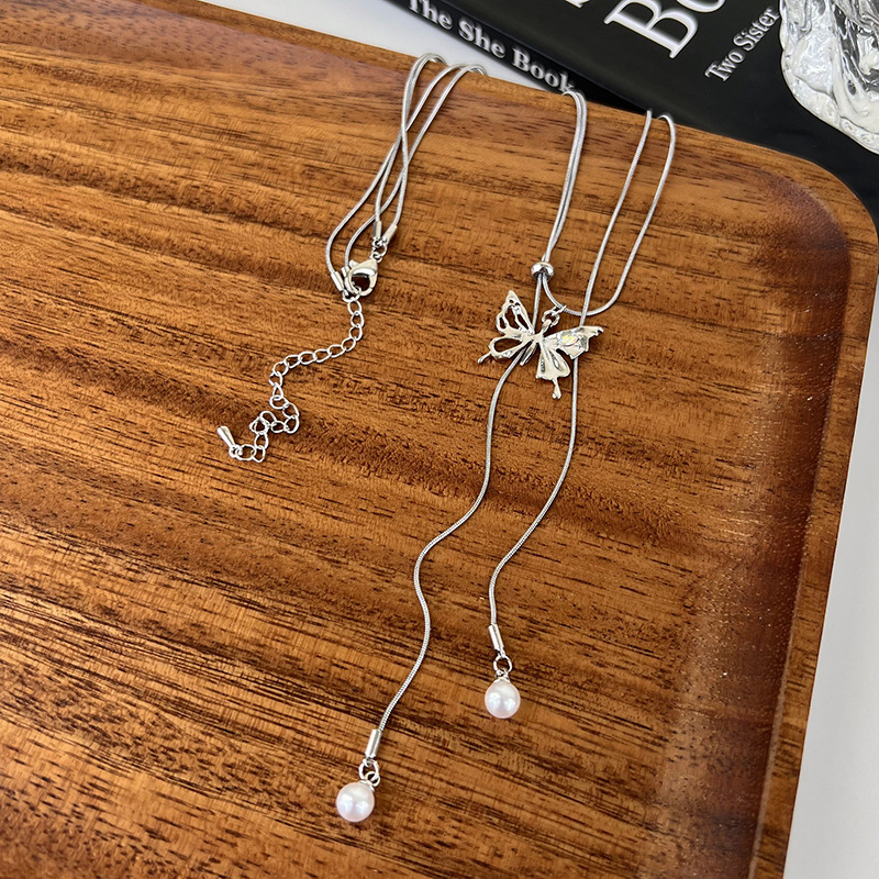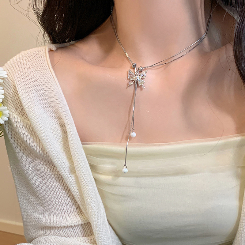 银色抽拉蝴蝶项链2023新款爆款珍珠流苏锁骨链颈链女轻奢小众气质