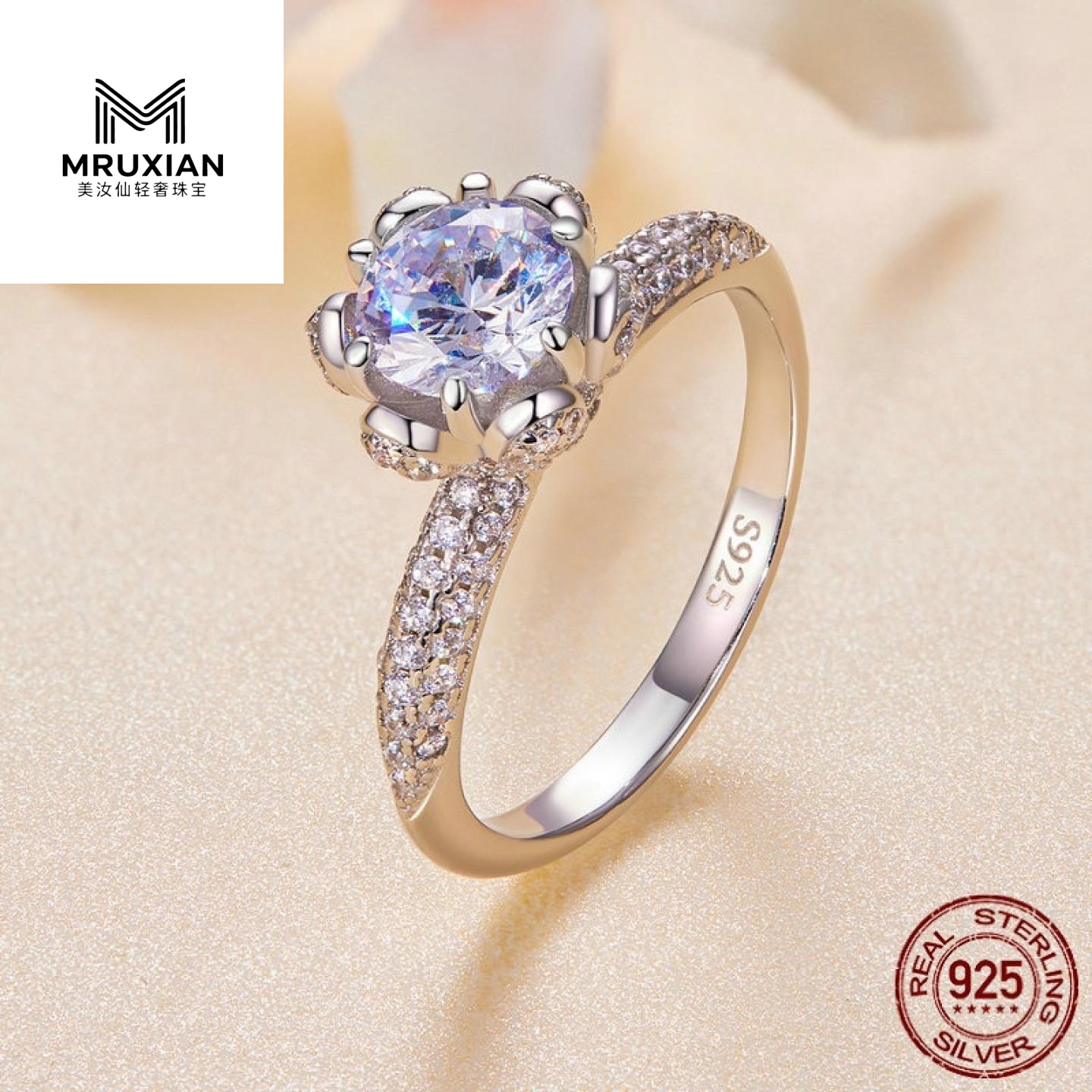 MRUXIAN 克拉经典六爪花朵莫桑石戒指纯银镀白金指环女轻奢高级感
