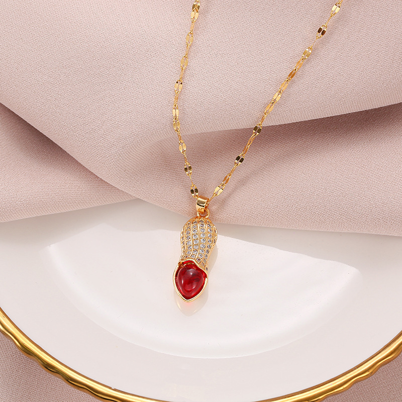 招财红色水晶锆石花生项链女钛钢18k镀金色豪华镶钻锁骨链配饰品