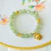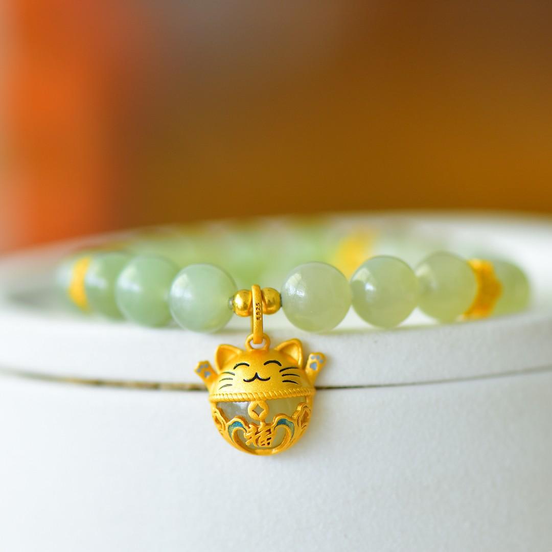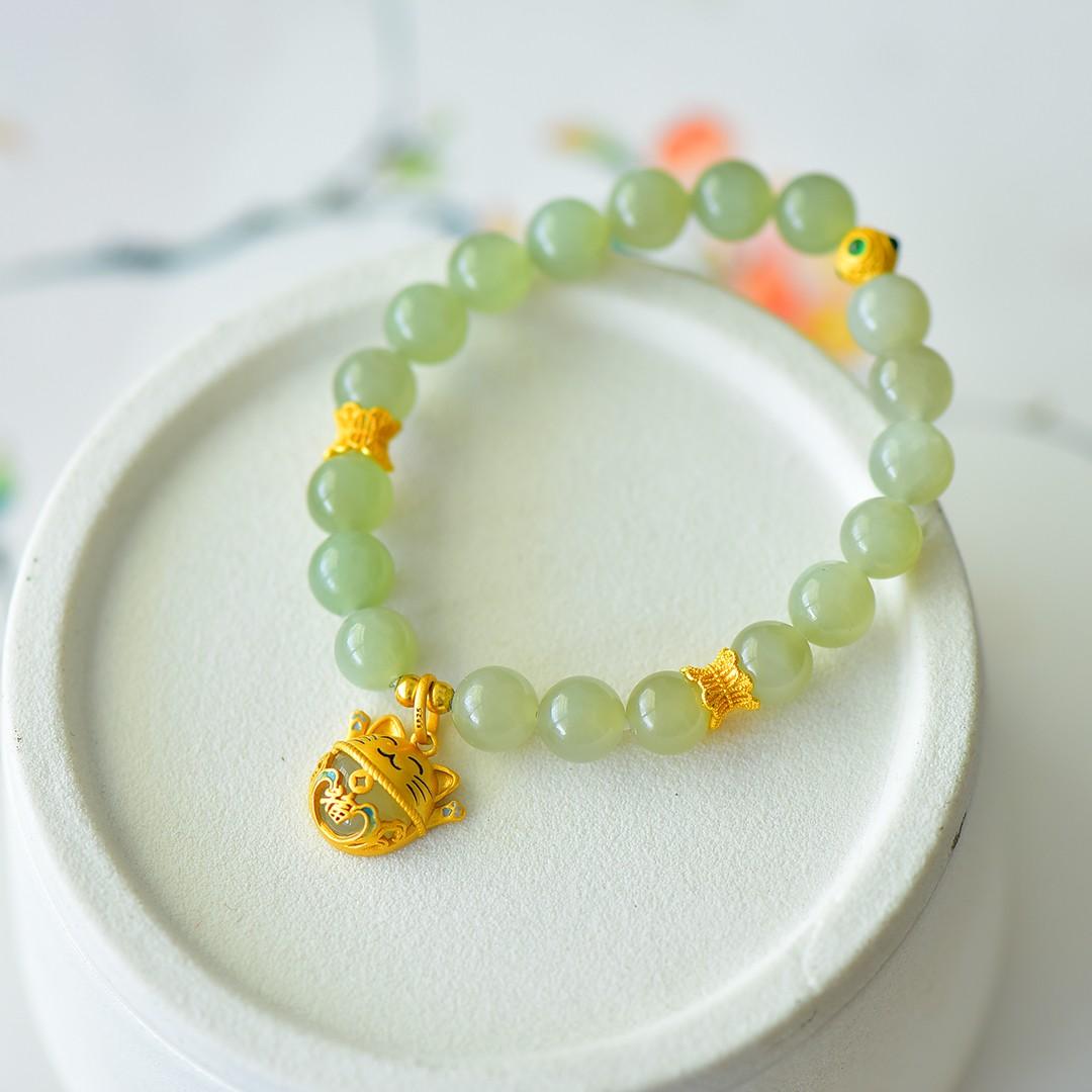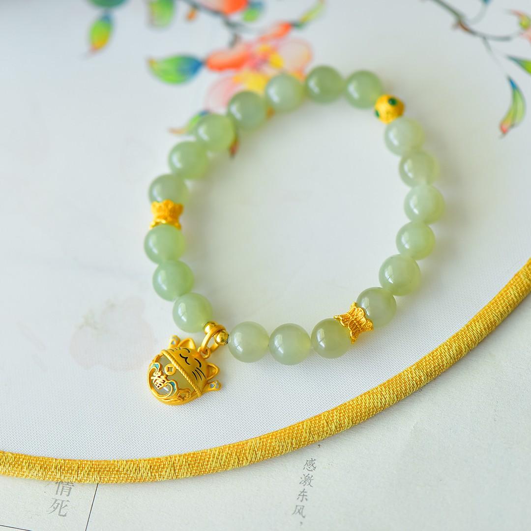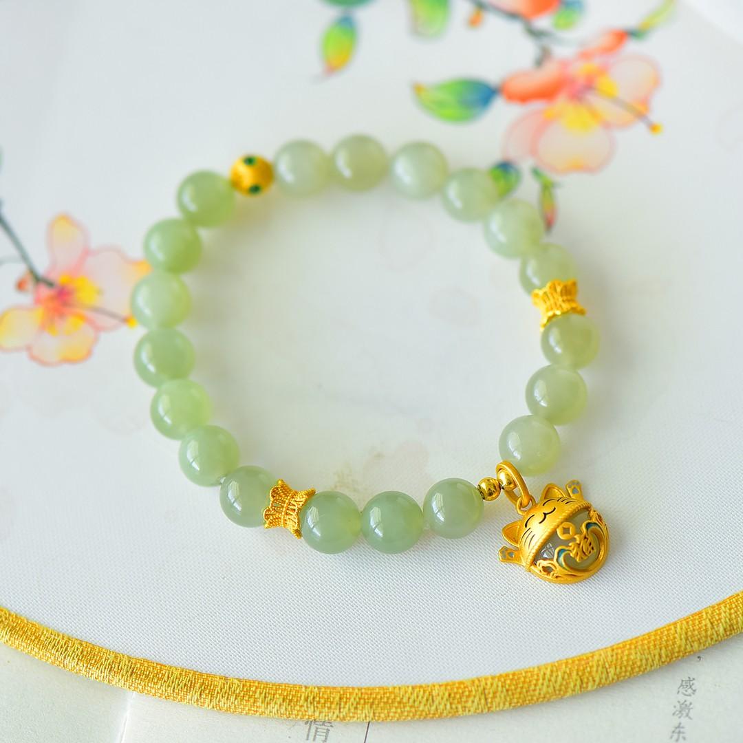 招财猫天然和田手串玉福虎手链串珠女单圈圆珠纯银镀黄金礼物8m