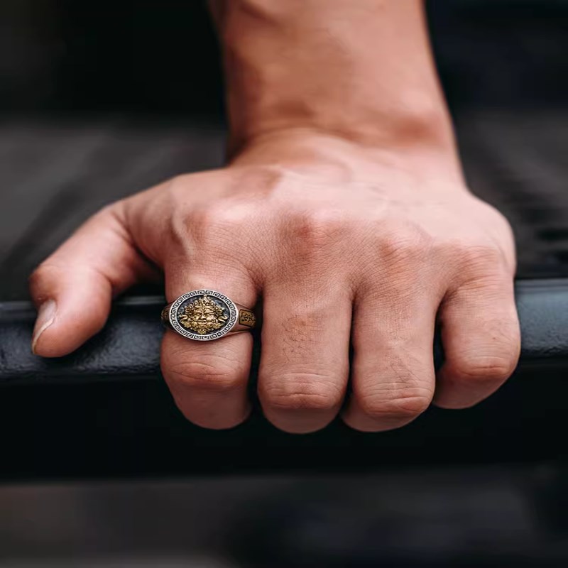 镀S925银立体黄财神戒指男y士复古高级感国风指环礼物招财四方柱