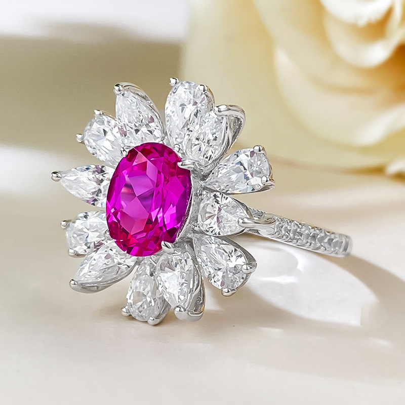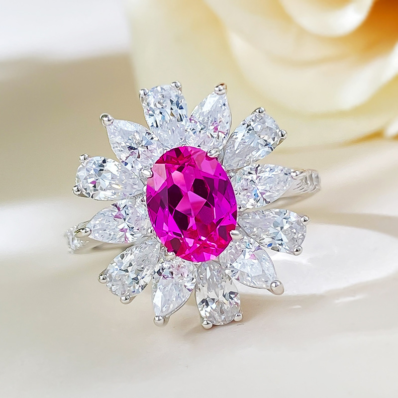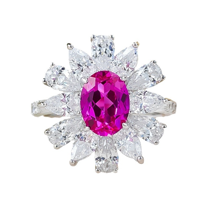 欧美跨境经典款珠宝2024新款玫红色高碳钻6*8mm椭圆宝石戒指女士