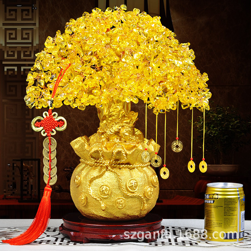 鸿瀚轩黄水晶发财树摆件家居客厅玄关店铺桌面装饰品开业乔迁礼物