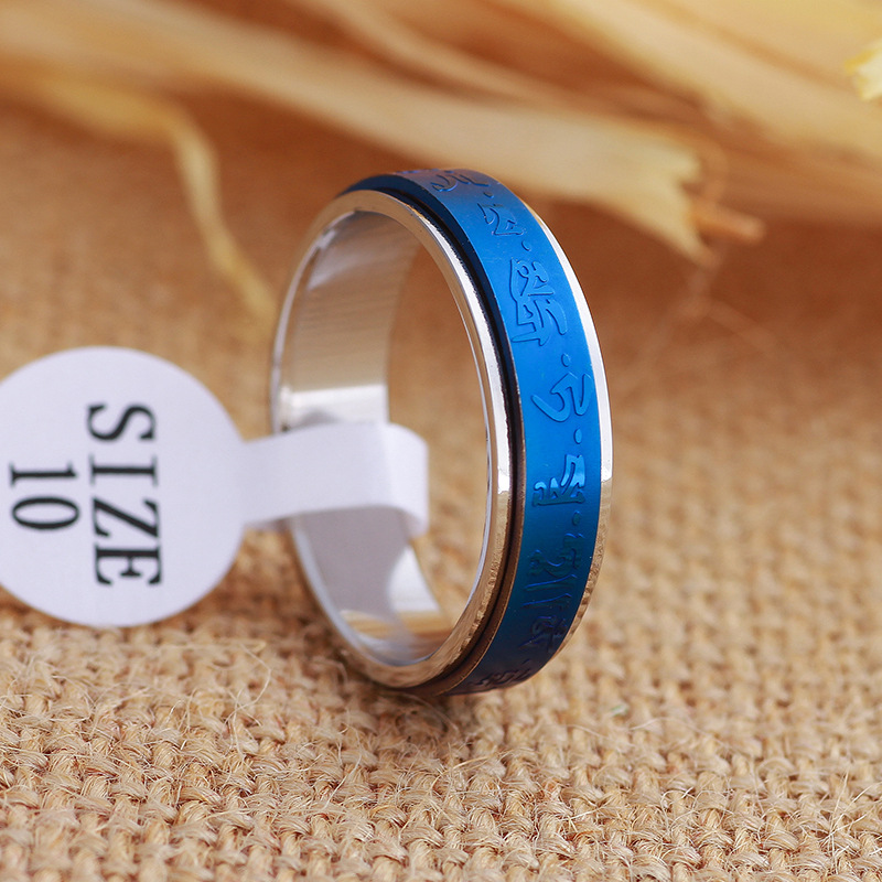 结缘钛钢蓝药师心咒戒指吊坠转运食指男女对戒可转动指环 包邮