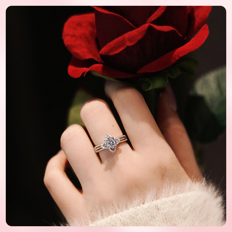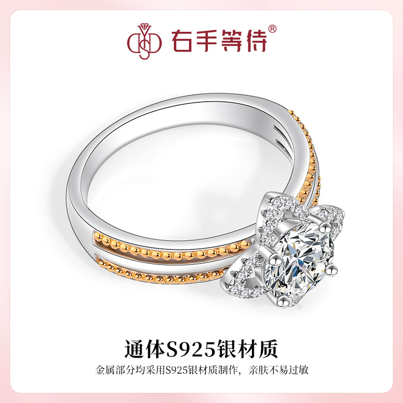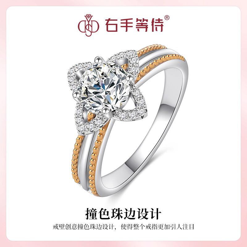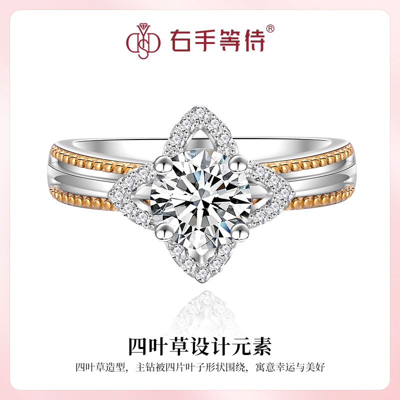 右手等待星途S925纯银正品莫桑石欧美撞色珠边四叶草镶钻戒指女